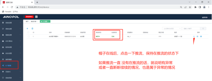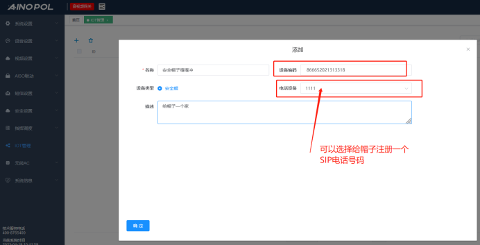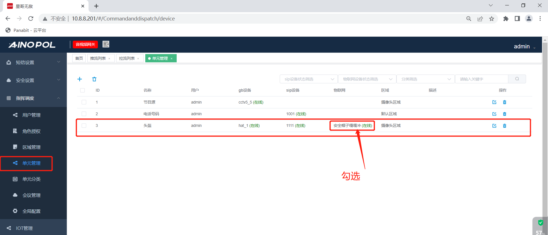 目录 搜索 光迅音视频网关简介如何登陆系统注:通过阿里云安装AVG系统话务台功能1.0 话务台使用向导1.1 主控台1.2 应急广播&夜服1.3 唤醒服务1.4 团队列表1.5 联系人1.6 分机管理1.7 唤醒记录1.8 通话CDR1.9 记事本1.10 黑名单常用功能介绍1、高级设置(强接、盲转、询问转、呼叫前转)2、广播IP喇叭背景音乐设置3、IVR导航设置(语音呼入导航)4、呼叫中心(短号直呼)群顺振一、系统设置1.1 网络设置1.1.1 聚合设置1.2 主机设置1.3 DHCP设置1.4 DNS服务1.5 系统工具1.5.1 简易抓包1.6 区域管理1.7 双机热备1.8 磁盘配置1.9 权限管理1.10 管理设置1.11 运行状态1.12 日志管理二、语音设置2.1 基础设置2.2 IVR导航2.3 外线设置2.4 外线组2.5 分机设置2.6 会议室2.8 呼叫中心( 短号直呼 )2.9 广播设置2.10 多方通话( IP分机具备免摘强制接听)2.11 路由设置2.12 唤醒服务2.13 语音服务2.14 通话CDR2.15 高级设置2.16 通讯录三、视频设置3.1 录制回看(维)3.2 国标设备3.2 推流列表(被动)3.3 拉流列表(主动)3.4 国际级联3.5 直播广场3.6 GB28181四、AISO 联动4.1 预案设置(号码触发)4.2 排队通知(定时播放音频)4.3 短信设置4.4 外部链接五、短信设置(维护)5.1 短信网关5.2 短信模板5.3 发送记录六、安全设置6.1 语音ACL6.2 安全策略6.3 IP黑白名单6.4 主叫黑名单(热门)七、指挥调度(热门)7.0 指挥调度开局说明( 推荐 )7.1 用户管理7.2 角色授权7.3 区域管理7.4 单元管理7.5 单元分类7.6 会议管理7.7 全局设置(地图)八、IOT管理(物联网设备)九、无线AC9.1 AP+管理9.2 网络模板9.3 定时重启9.4 AP+升级十、系统信息-系统升级 暂无相关搜索结果! 本文档由 智慧光迅 发布 八、IOT管理(物联网设备) 1:添加 头盔编码,新增互联网设备( 编号需要通过设备获取查询 )2:检查一下推流列表(对接成功就会有一个)3:检查可以观看后,然后可以在“指挥调度” 》 “单元管理” ,将此头盔添加4:最后去指挥调度看效果!~'环境说明' 系统版本:C01V02R003P2304141:添加 头盔编码,新增互联网设备( 编号需要通过设备获取查询 )2:检查一下推流列表(对接成功就会有一个)3:检查可以观看后,然后可以在“指挥调度” 》 “单元管理” ,将此头盔添加4:最后去指挥调度看效果!~文档更新时间: 2023-10-18 10:10 作者:admin