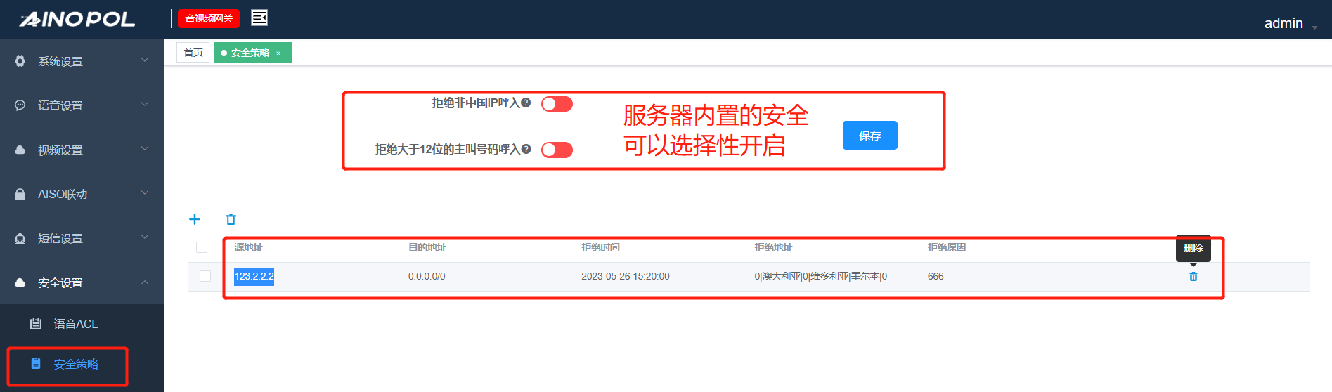 目录 搜索 光迅音视频网关简介如何登陆系统注:通过阿里云安装AVG系统话务台功能1.0 话务台使用向导1.1 主控台1.2 应急广播&夜服1.3 唤醒服务1.4 团队列表1.5 联系人1.6 分机管理1.7 唤醒记录1.8 通话CDR1.9 记事本1.10 黑名单常用功能介绍1、高级设置(强接、盲转、询问转、呼叫前转)2、广播IP喇叭背景音乐设置3、IVR导航设置(语音呼入导航)4、呼叫中心(短号直呼)群顺振一、系统设置1.1 网络设置1.1.1 聚合设置1.2 主机设置1.3 DHCP设置1.4 DNS服务1.5 系统工具1.5.1 简易抓包1.6 区域管理1.7 双机热备1.8 磁盘配置1.9 权限管理1.10 管理设置1.11 运行状态1.12 日志管理二、语音设置2.1 基础设置2.2 IVR导航2.3 外线设置2.4 外线组2.5 分机设置2.6 会议室2.8 呼叫中心( 短号直呼 )2.9 广播设置2.10 多方通话( IP分机具备免摘强制接听)2.11 路由设置2.12 唤醒服务2.13 语音服务2.14 通话CDR2.15 高级设置2.16 通讯录三、视频设置3.1 录制回看(维)3.2 国标设备3.2 推流列表(被动)3.3 拉流列表(主动)3.4 国际级联3.5 直播广场3.6 GB28181四、AISO 联动4.1 预案设置(号码触发)4.2 排队通知(定时播放音频)4.3 短信设置4.4 外部链接五、短信设置(维护)5.1 短信网关5.2 短信模板5.3 发送记录六、安全设置6.1 语音ACL6.2 安全策略6.3 IP黑白名单6.4 主叫黑名单(热门)七、指挥调度(热门)7.0 指挥调度开局说明( 推荐 )7.1 用户管理7.2 角色授权7.3 区域管理7.4 单元管理7.5 单元分类7.6 会议管理7.7 全局设置(地图)八、IOT管理(物联网设备)九、无线AC9.1 AP+管理9.2 网络模板9.3 定时重启9.4 AP+升级十、系统信息-系统升级 暂无相关搜索结果! 本文档由 智慧光迅 发布 6.2 安全策略 1:服务器内置的安全策略, 可以快速开启,有效预防国外IP呼入,防盗打等'环境说明' 系统版本:C01V02R003P2304141:服务器内置的安全策略, 可以快速开启,有效预防国外IP呼入,防盗打等文档更新时间: 2023-05-26 15:21 作者:admin