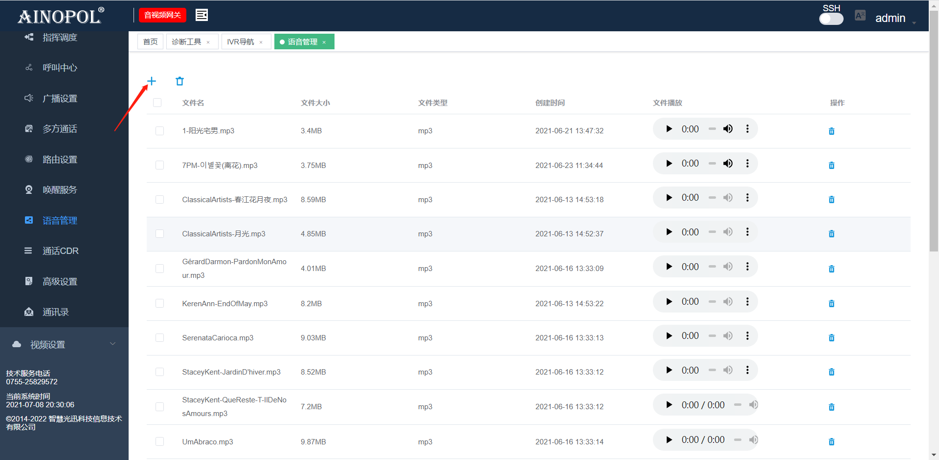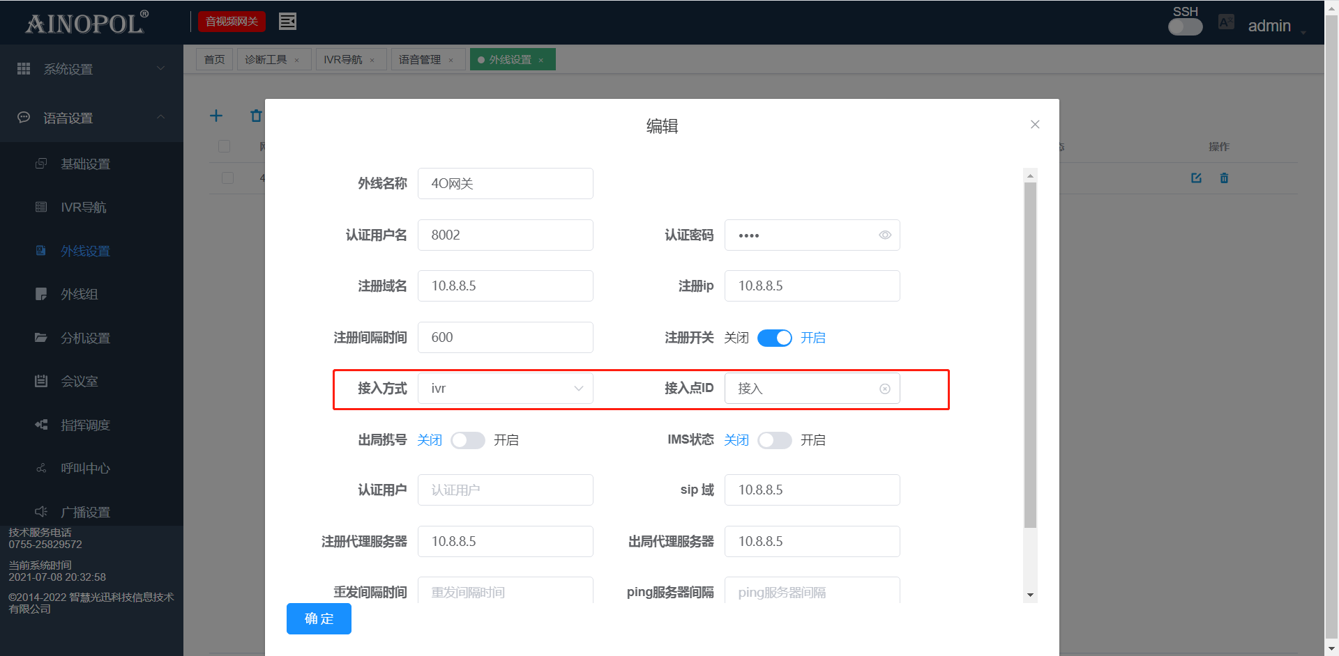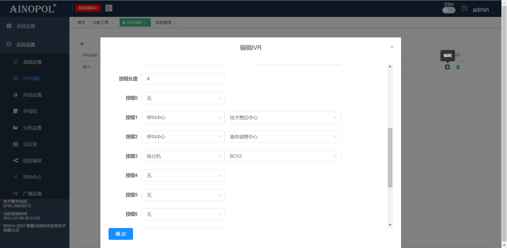 目录 搜索 光迅音视频网关简介如何登陆系统注:通过阿里云安装AVG系统话务台功能1.0 话务台使用向导1.1 主控台1.2 应急广播&夜服1.3 唤醒服务1.4 团队列表1.5 联系人1.6 分机管理1.7 唤醒记录1.8 通话CDR1.9 记事本1.10 黑名单常用功能介绍1、高级设置(强接、盲转、询问转、呼叫前转)2、广播IP喇叭背景音乐设置3、IVR导航设置(语音呼入导航)4、呼叫中心(短号直呼)群顺振一、系统设置1.1 网络设置1.1.1 聚合设置1.2 主机设置1.3 DHCP设置1.4 DNS服务1.5 系统工具1.5.1 简易抓包1.6 区域管理1.7 双机热备1.8 磁盘配置1.9 权限管理1.10 管理设置1.11 运行状态1.12 日志管理二、语音设置2.1 基础设置2.2 IVR导航2.3 外线设置2.4 外线组2.5 分机设置2.6 会议室2.8 呼叫中心( 短号直呼 )2.9 广播设置2.10 多方通话( IP分机具备免摘强制接听)2.11 路由设置2.12 唤醒服务2.13 语音服务2.14 通话CDR2.15 高级设置2.16 通讯录三、视频设置3.1 录制回看(维)3.2 国标设备3.2 推流列表(被动)3.3 拉流列表(主动)3.4 国际级联3.5 直播广场3.6 GB28181四、AISO 联动4.1 预案设置(号码触发)4.2 排队通知(定时播放音频)4.3 短信设置4.4 外部链接五、短信设置(维护)5.1 短信网关5.2 短信模板5.3 发送记录六、安全设置6.1 语音ACL6.2 安全策略6.3 IP黑白名单6.4 主叫黑名单(热门)七、指挥调度(热门)7.0 指挥调度开局说明( 推荐 )7.1 用户管理7.2 角色授权7.3 区域管理7.4 单元管理7.5 单元分类7.6 会议管理7.7 全局设置(地图)八、IOT管理(物联网设备)九、无线AC9.1 AP+管理9.2 网络模板9.3 定时重启9.4 AP+升级十、系统信息-系统升级 暂无相关搜索结果! 本文档由 智慧光迅 发布 2.2 IVR导航 IVR导航设置1. 导航设置,针对有外线的情况,当外线呼入的时候,先接听导航语音(上传语音包,提前录制好所需要内容按钮提示)(然后电话按 X 键 实现转接到内网 某一些部门,或某分机方式)2. 编辑 IVR 导航设置 (此处设置的是按1 转技术支持,按2 转商务 ,按3 转接BOSS ,根据音频来变动 )3. IVR 导航配搭 外线呼入的方式调用(每个外线可以调用不一样的导航!)IVR导航设置1. 导航设置,针对有外线的情况,当外线呼入的时候,先接听导航语音(上传语音包,提前录制好所需要内容按钮提示)(然后电话按 X 键 实现转接到内网 某一些部门,或某分机方式)2. 编辑 IVR 导航设置 (此处设置的是按1 转技术支持,按2 转商务 ,按3 转接BOSS ,根据音频来变动 )3. IVR 导航配搭 外线呼入的方式调用(每个外线可以调用不一样的导航!)文档更新时间: 2022-03-08 09:54 作者:admin