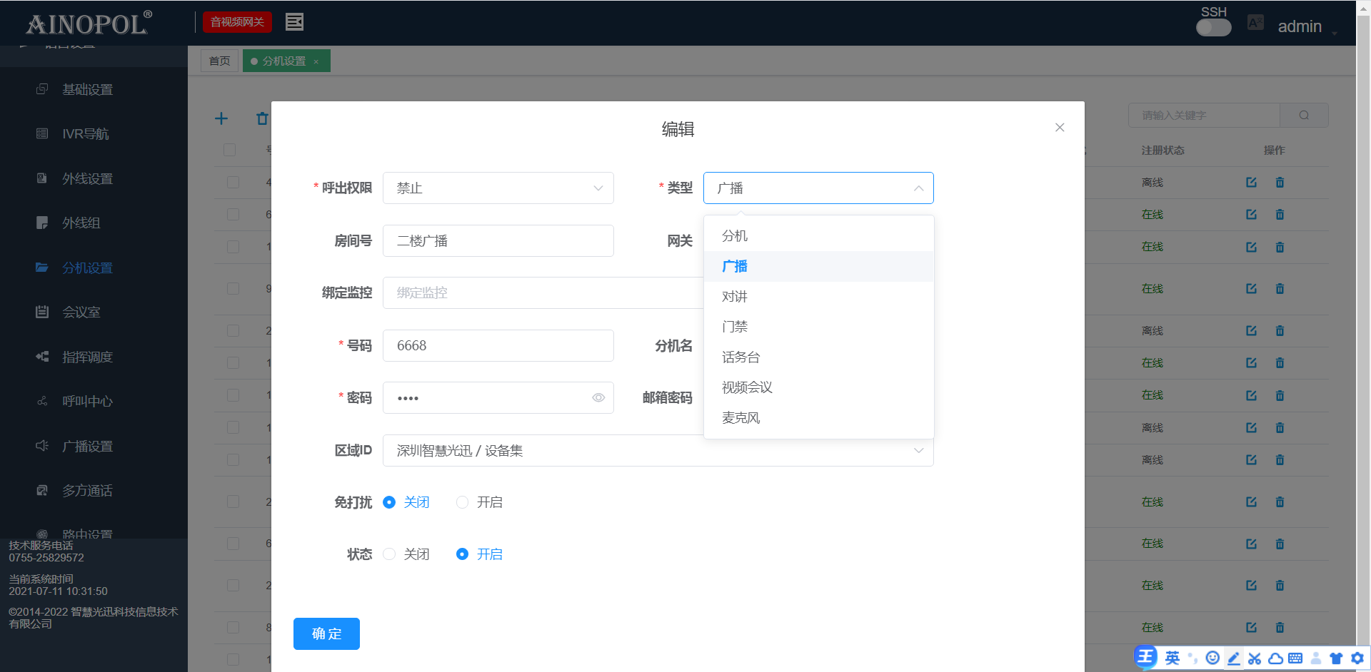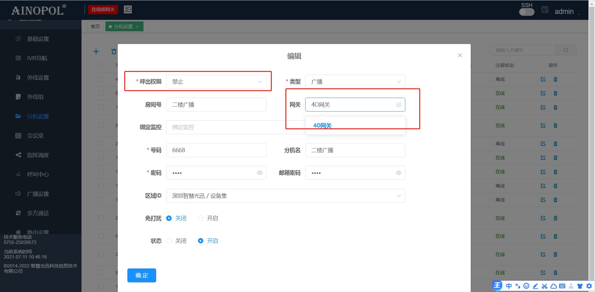 目录 搜索 光迅音视频网关简介如何登陆系统注:通过阿里云安装AVG系统话务台功能1.0 话务台使用向导1.1 主控台1.2 应急广播&夜服1.3 唤醒服务1.4 团队列表1.5 联系人1.6 分机管理1.7 唤醒记录1.8 通话CDR1.9 记事本1.10 黑名单常用功能介绍1、高级设置(强接、盲转、询问转、呼叫前转)2、广播IP喇叭背景音乐设置3、IVR导航设置(语音呼入导航)4、呼叫中心(短号直呼)群顺振一、系统设置1.1 网络设置1.1.1 聚合设置1.2 主机设置1.3 DHCP设置1.4 DNS服务1.5 系统工具1.5.1 简易抓包1.6 区域管理1.7 双机热备1.8 磁盘配置1.9 权限管理1.10 管理设置1.11 运行状态1.12 日志管理二、语音设置2.1 基础设置2.2 IVR导航2.3 外线设置2.4 外线组2.5 分机设置2.6 会议室2.8 呼叫中心( 短号直呼 )2.9 广播设置2.10 多方通话( IP分机具备免摘强制接听)2.11 路由设置2.12 唤醒服务2.13 语音服务2.14 通话CDR2.15 高级设置2.16 通讯录三、视频设置3.1 录制回看(维)3.2 国标设备3.2 推流列表(被动)3.3 拉流列表(主动)3.4 国际级联3.5 直播广场3.6 GB28181四、AISO 联动4.1 预案设置(号码触发)4.2 排队通知(定时播放音频)4.3 短信设置4.4 外部链接五、短信设置(维护)5.1 短信网关5.2 短信模板5.3 发送记录六、安全设置6.1 语音ACL6.2 安全策略6.3 IP黑白名单6.4 主叫黑名单(热门)七、指挥调度(热门)7.0 指挥调度开局说明( 推荐 )7.1 用户管理7.2 角色授权7.3 区域管理7.4 单元管理7.5 单元分类7.6 会议管理7.7 全局设置(地图)八、IOT管理(物联网设备)九、无线AC9.1 AP+管理9.2 网络模板9.3 定时重启9.4 AP+升级十、系统信息-系统升级 暂无相关搜索结果! 本文档由 智慧光迅 发布 2.5 分机设置 1.添加电话分机,设置分机的类型!2.设置分机打长途或者不允许打外线,设置从外线的哪个口子出局3.如果分机过多可以直接编辑好直接批量导入1.添加电话分机,设置分机的类型!2.设置分机打长途或者不允许打外线,设置从外线的哪个口子出局3.如果分机过多可以直接编辑好直接批量导入文档更新时间: 2022-03-08 09:56 作者:admin