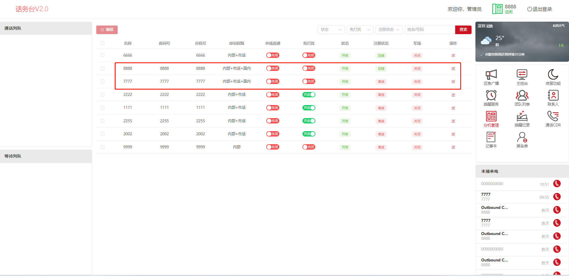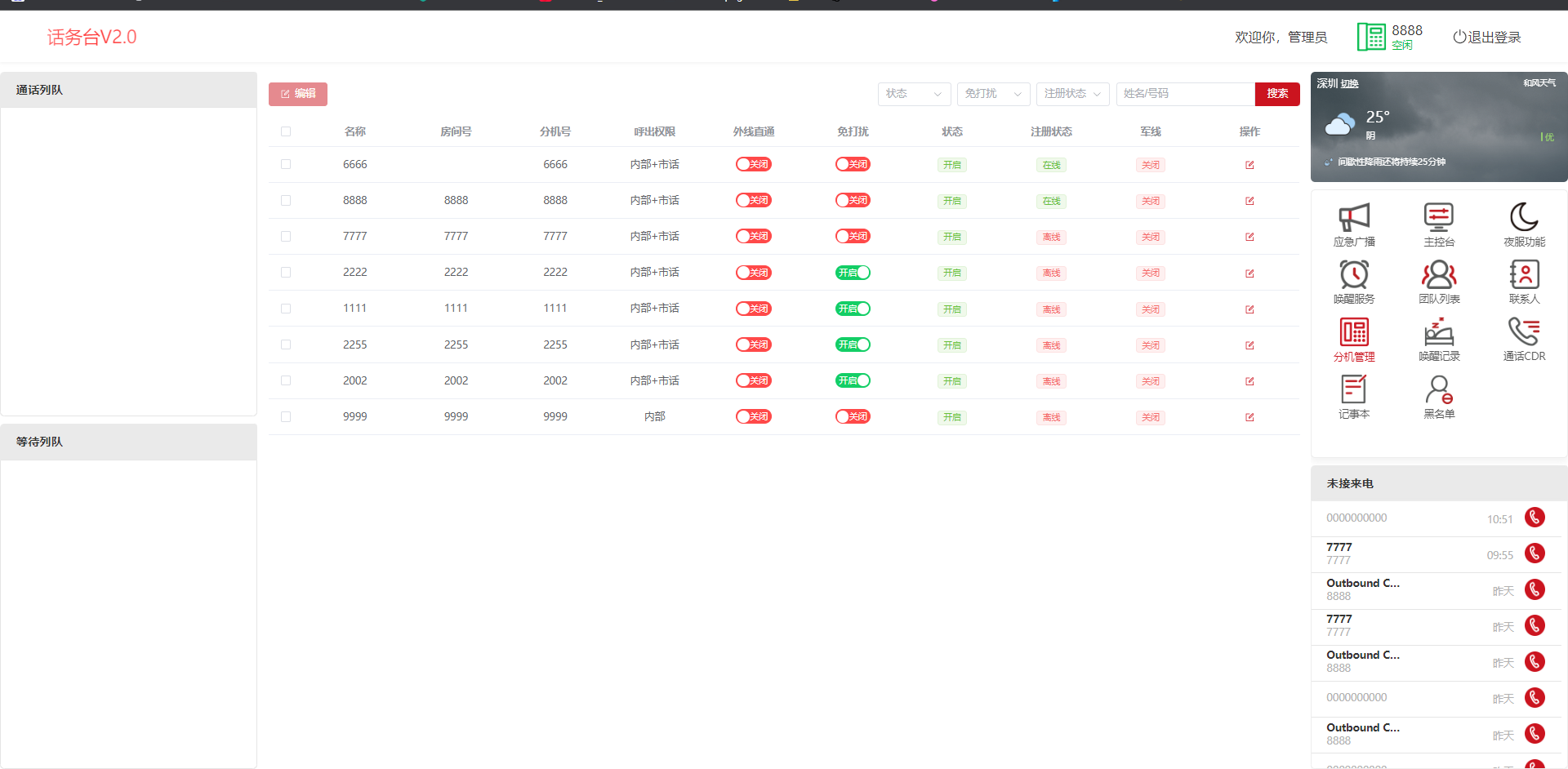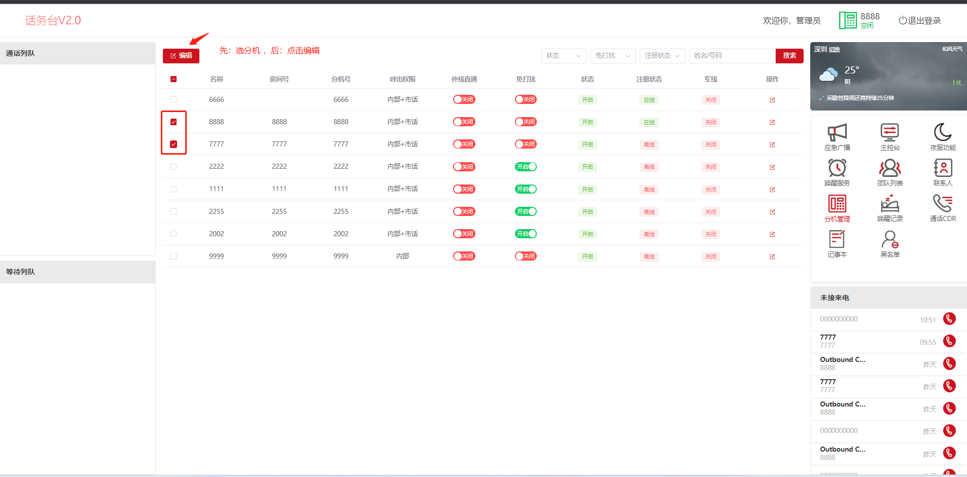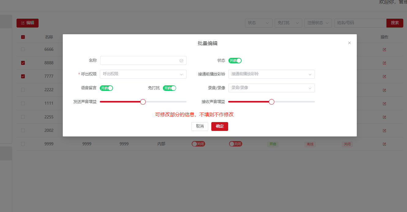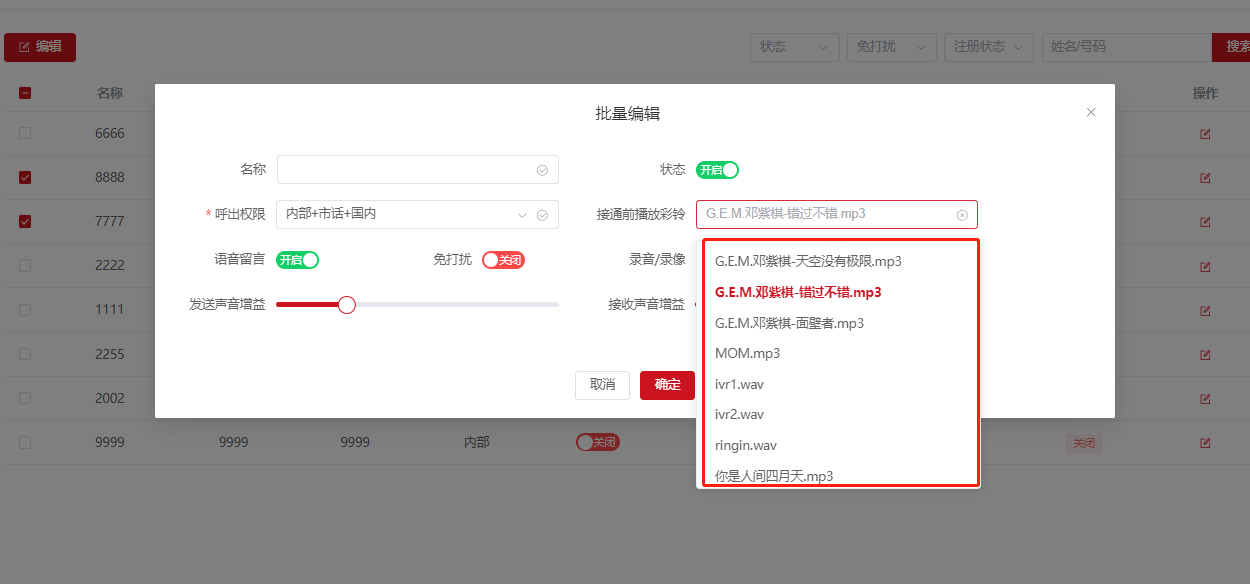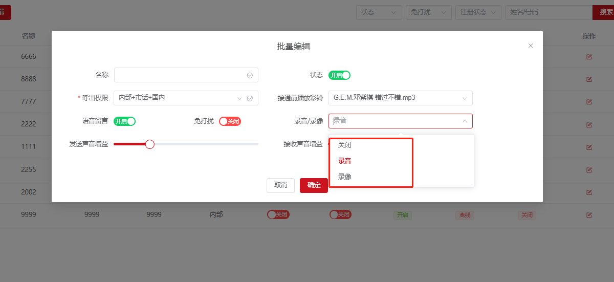 描述:用于管理内部分机信息、状态等注:添加分机需要到系统后台,这里只能编辑分机示例:编辑分机的信息,选中需要修改的分机,点击左上角的编辑按钮(这里是批量编辑)例:对6666,8888这两个分机号,修改呼叫权限,彩铃等信息修改后点击提交即可注:彩铃音频 需要在系统后台的 语音管理 操作注2:录音录像:对应两种格式:录音的格式为MP3,录像格式则是MP4填写完后 点击提交,列表会显示最新同步修改的信息描述:用于管理内部分机信息、状态等注:添加分机需要到系统后台,这里只能编辑分机示例:编辑分机的信息,选中需要修改的分机,点击左上角的编辑按钮(这里是批量编辑)例:对6666,8888这两个分机号,修改呼叫权限,彩铃等信息修改后点击提交即可注:彩铃音频 需要在系统后台的 语音管理 操作注2:录音录像:对应两种格式:录音的格式为MP3,录像格式则是MP4填写完后 点击提交,列表会显示最新同步修改的信息文档更新时间: 2023-10-25 13:54 作者:admin