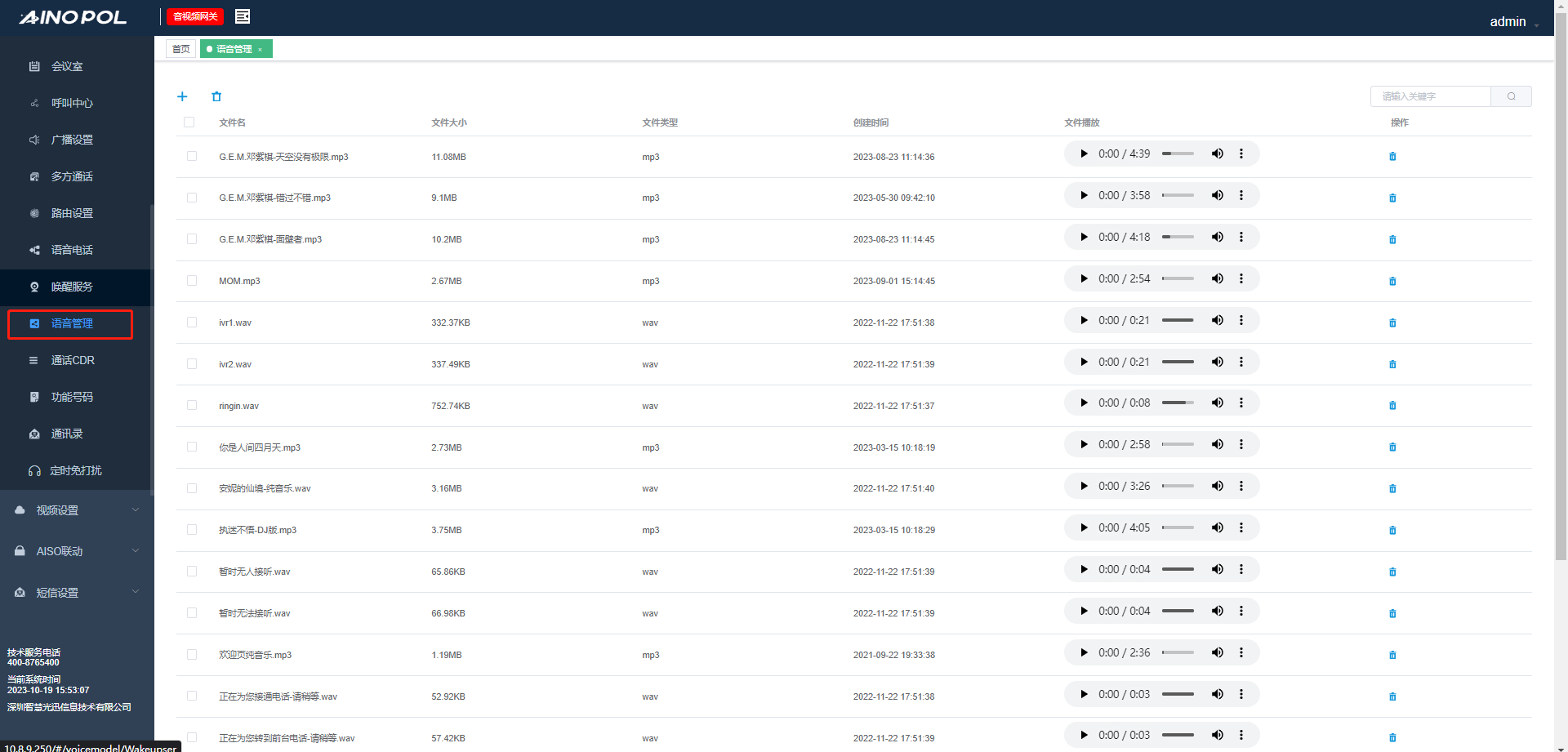 目录 搜索 光迅音视频网关简介如何登陆系统注:通过阿里云安装AVG系统话务台功能1.0 话务台使用向导1.1 主控台1.2 应急广播&夜服1.3 唤醒服务1.4 团队列表1.5 联系人1.6 分机管理1.7 唤醒记录1.8 通话CDR1.9 记事本1.10 黑名单常用功能介绍1、高级设置(强接、盲转、询问转、呼叫前转)2、广播IP喇叭背景音乐设置3、IVR导航设置(语音呼入导航)4、呼叫中心(短号直呼)群顺振一、系统设置1.1 网络设置1.1.1 聚合设置1.2 主机设置1.3 DHCP设置1.4 DNS服务1.5 系统工具1.5.1 简易抓包1.6 区域管理1.7 双机热备1.8 磁盘配置1.9 权限管理1.10 管理设置1.11 运行状态1.12 日志管理二、语音设置2.1 基础设置2.2 IVR导航2.3 外线设置2.4 外线组2.5 分机设置2.6 会议室2.8 呼叫中心( 短号直呼 )2.9 广播设置2.10 多方通话( IP分机具备免摘强制接听)2.11 路由设置2.12 唤醒服务2.13 语音服务2.14 通话CDR2.15 高级设置2.16 通讯录三、视频设置3.1 录制回看(维)3.2 国标设备3.2 推流列表(被动)3.3 拉流列表(主动)3.4 国际级联3.5 直播广场3.6 GB28181四、AISO 联动4.1 预案设置(号码触发)4.2 排队通知(定时播放音频)4.3 短信设置4.4 外部链接五、短信设置(维护)5.1 短信网关5.2 短信模板5.3 发送记录六、安全设置6.1 语音ACL6.2 安全策略6.3 IP黑白名单6.4 主叫黑名单(热门)七、指挥调度(热门)7.0 指挥调度开局说明( 推荐 )7.1 用户管理7.2 角色授权7.3 区域管理7.4 单元管理7.5 单元分类7.6 会议管理7.7 全局设置(地图)八、IOT管理(物联网设备)九、无线AC9.1 AP+管理9.2 网络模板9.3 定时重启9.4 AP+升级十、系统信息-系统升级 暂无相关搜索结果! 本文档由 智慧光迅 发布 1.6 分机管理 描述:用于管理内部分机信息、状态等注:添加分机需要到系统后台,这里只能编辑分机示例:编辑分机的信息,选中需要修改的分机,点击左上角的编辑按钮(这里是批量编辑)例:对6666,8888这两个分机号,修改呼叫权限,彩铃等信息修改后点击提交即可注:彩铃音频 需要在系统后台的 语音管理 操作注2:录音录像:对应两种格式:录音的格式为MP3,录像格式则是MP4填写完后 点击提交,列表会显示最新同步修改的信息描述:用于管理内部分机信息、状态等注:添加分机需要到系统后台,这里只能编辑分机示例:编辑分机的信息,选中需要修改的分机,点击左上角的编辑按钮(这里是批量编辑)例:对6666,8888这两个分机号,修改呼叫权限,彩铃等信息修改后点击提交即可注:彩铃音频 需要在系统后台的 语音管理 操作注2:录音录像:对应两种格式:录音的格式为MP3,录像格式则是MP4填写完后 点击提交,列表会显示最新同步修改的信息文档更新时间: 2023-10-25 13:54 作者:admin