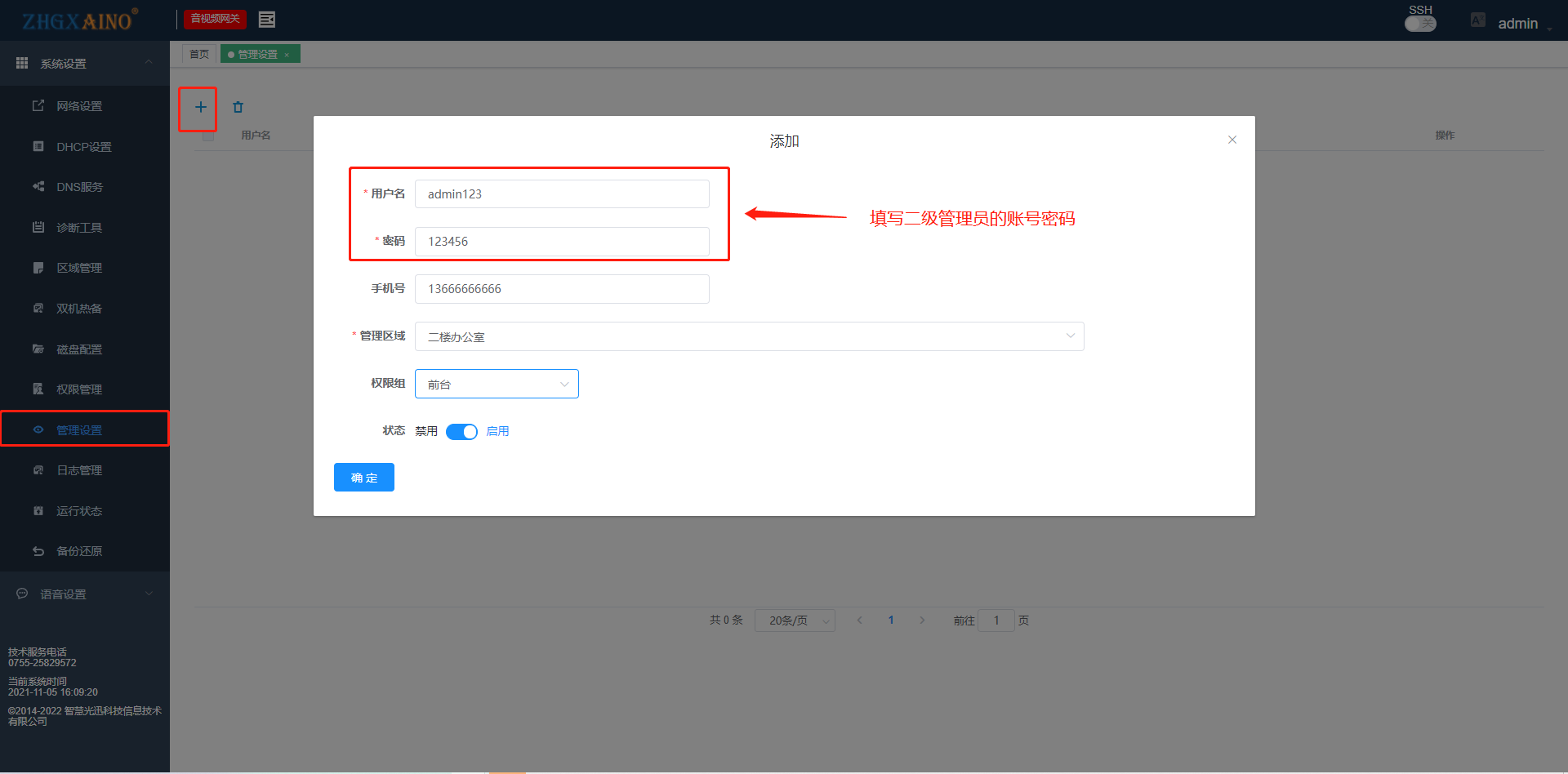 目录 搜索 光迅音视频网关简介如何登陆系统注:通过阿里云安装AVG系统话务台功能1.0 话务台使用向导1.1 主控台1.2 应急广播&夜服1.3 唤醒服务1.4 团队列表1.5 联系人1.6 分机管理1.7 唤醒记录1.8 通话CDR1.9 记事本1.10 黑名单常用功能介绍1、高级设置(强接、盲转、询问转、呼叫前转)2、广播IP喇叭背景音乐设置3、IVR导航设置(语音呼入导航)4、呼叫中心(短号直呼)群顺振一、系统设置1.1 网络设置1.1.1 聚合设置1.2 主机设置1.3 DHCP设置1.4 DNS服务1.5 系统工具1.5.1 简易抓包1.6 区域管理1.7 双机热备1.8 磁盘配置1.9 权限管理1.10 管理设置1.11 运行状态1.12 日志管理二、语音设置2.1 基础设置2.2 IVR导航2.3 外线设置2.4 外线组2.5 分机设置2.6 会议室2.8 呼叫中心( 短号直呼 )2.9 广播设置2.10 多方通话( IP分机具备免摘强制接听)2.11 路由设置2.12 唤醒服务2.13 语音服务2.14 通话CDR2.15 高级设置2.16 通讯录三、视频设置3.1 录制回看(维)3.2 国标设备3.2 推流列表(被动)3.3 拉流列表(主动)3.4 国际级联3.5 直播广场3.6 GB28181四、AISO 联动4.1 预案设置(号码触发)4.2 排队通知(定时播放音频)4.3 短信设置4.4 外部链接五、短信设置(维护)5.1 短信网关5.2 短信模板5.3 发送记录六、安全设置6.1 语音ACL6.2 安全策略6.3 IP黑白名单6.4 主叫黑名单(热门)七、指挥调度(热门)7.0 指挥调度开局说明( 推荐 )7.1 用户管理7.2 角色授权7.3 区域管理7.4 单元管理7.5 单元分类7.6 会议管理7.7 全局设置(地图)八、IOT管理(物联网设备)九、无线AC9.1 AP+管理9.2 网络模板9.3 定时重启9.4 AP+升级十、系统信息-系统升级 暂无相关搜索结果! 本文档由 智慧光迅 发布 1.10 管理设置 管理设置创建二级管理员账号密码文档更新时间: 2023-05-25 17:48 作者:admin