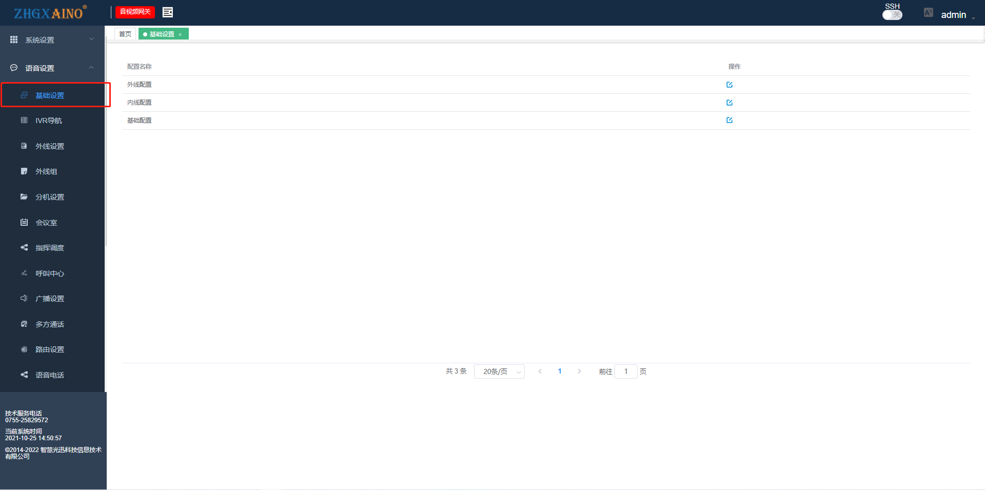 目录 搜索 光迅音视频网关简介如何登陆系统注:通过阿里云安装AVG系统话务台功能1.0 话务台使用向导1.1 主控台1.2 应急广播&夜服1.3 唤醒服务1.4 团队列表1.5 联系人1.6 分机管理1.7 唤醒记录1.8 通话CDR1.9 记事本1.10 黑名单常用功能介绍1、高级设置(强接、盲转、询问转、呼叫前转)2、广播IP喇叭背景音乐设置3、IVR导航设置(语音呼入导航)4、呼叫中心(短号直呼)群顺振一、系统设置1.1 网络设置1.1.1 聚合设置1.2 主机设置1.3 DHCP设置1.4 DNS服务1.5 系统工具1.5.1 简易抓包1.6 区域管理1.7 双机热备1.8 磁盘配置1.9 权限管理1.10 管理设置1.11 运行状态1.12 日志管理二、语音设置2.1 基础设置2.2 IVR导航2.3 外线设置2.4 外线组2.5 分机设置2.6 会议室2.8 呼叫中心( 短号直呼 )2.9 广播设置2.10 多方通话( IP分机具备免摘强制接听)2.11 路由设置2.12 唤醒服务2.13 语音服务2.14 通话CDR2.15 高级设置2.16 通讯录三、视频设置3.1 录制回看(维)3.2 国标设备3.2 推流列表(被动)3.3 拉流列表(主动)3.4 国际级联3.5 直播广场3.6 GB28181四、AISO 联动4.1 预案设置(号码触发)4.2 排队通知(定时播放音频)4.3 短信设置4.4 外部链接五、短信设置(维护)5.1 短信网关5.2 短信模板5.3 发送记录六、安全设置6.1 语音ACL6.2 安全策略6.3 IP黑白名单6.4 主叫黑名单(热门)七、指挥调度(热门)7.0 指挥调度开局说明( 推荐 )7.1 用户管理7.2 角色授权7.3 区域管理7.4 单元管理7.5 单元分类7.6 会议管理7.7 全局设置(地图)八、IOT管理(物联网设备)九、无线AC9.1 AP+管理9.2 网络模板9.3 定时重启9.4 AP+升级十、系统信息-系统升级 暂无相关搜索结果! 本文档由 智慧光迅 发布 2.1 基础设置 基础设置1.外线配置外线IP与NAT穿透IP一致并且设置能和落地网关通信的IP编码协商,默认全选注册周期设置晚编码协商默认开启2.内线配置内线IP:设定内线SIP服务器地址NAT穿透IP:设定内线SIP服务器地址相同的IP基础设置1.外线配置外线IP与NAT穿透IP一致并且设置能和落地网关通信的IP编码协商,默认全选注册周期设置晚编码协商默认开启2.内线配置内线IP:设定内线SIP服务器地址NAT穿透IP:设定内线SIP服务器地址相同的IP文档更新时间: 2022-03-08 09:56 作者:admin