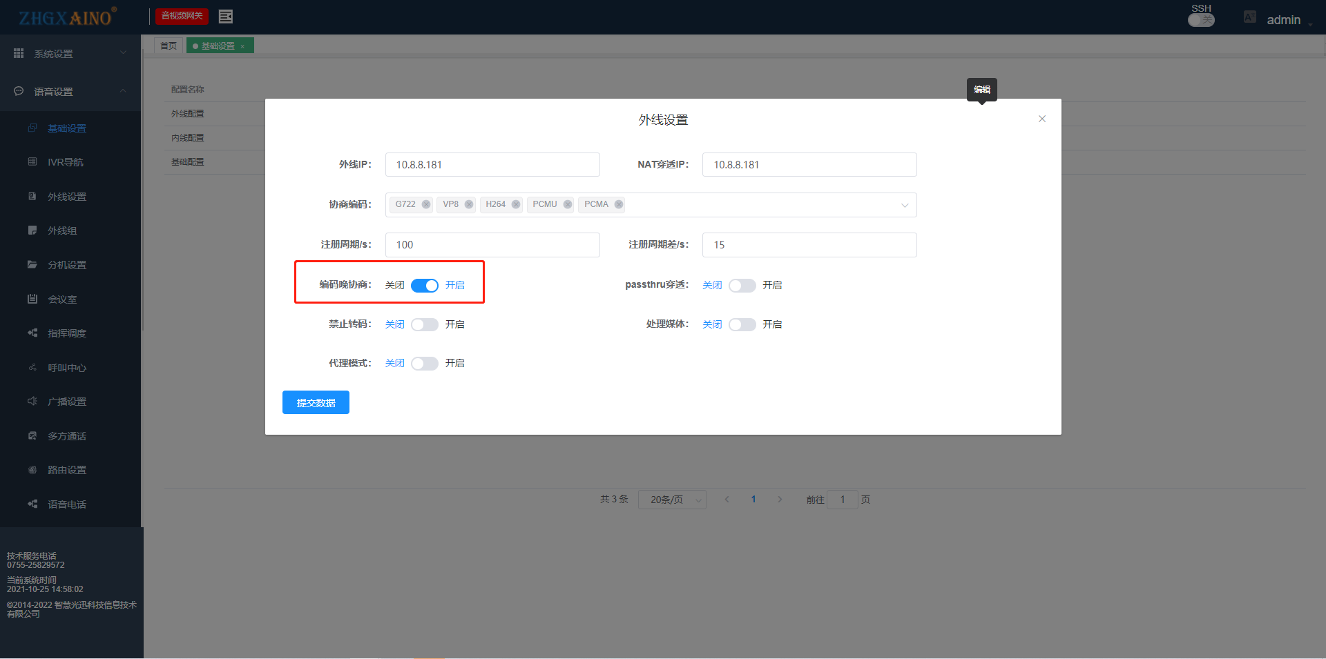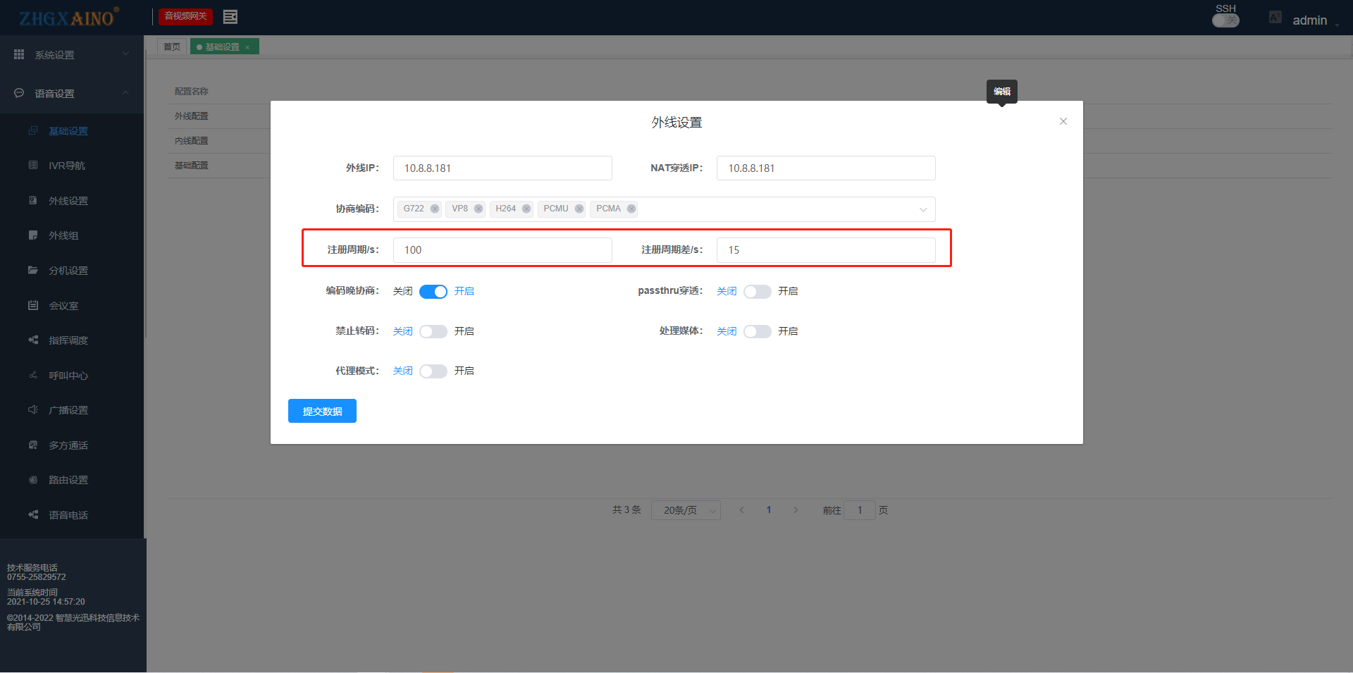 基础设置1.外线配置外线IP与NAT穿透IP一致并且设置能和落地网关通信的IP编码协商,默认全选注册周期设置晚编码协商默认开启2.内线配置内线IP:设定内线SIP服务器地址NAT穿透IP:设定内线SIP服务器地址相同的IP基础设置1.外线配置外线IP与NAT穿透IP一致并且设置能和落地网关通信的IP编码协商,默认全选注册周期设置晚编码协商默认开启2.内线配置内线IP:设定内线SIP服务器地址NAT穿透IP:设定内线SIP服务器地址相同的IP文档更新时间: 2022-03-08 09:56 作者:admin