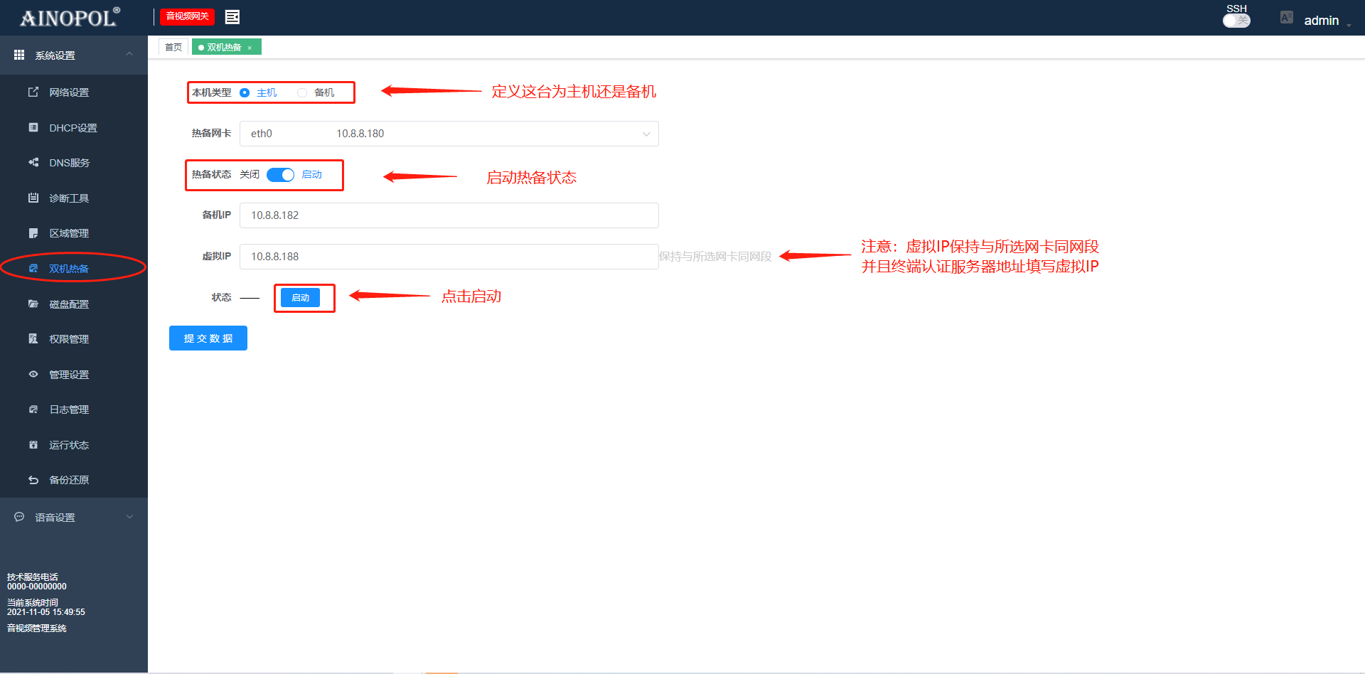目录 搜索 光迅音视频网关简介如何登陆系统注:通过阿里云安装AVG系统话务台功能1.0 话务台使用向导1.1 主控台1.2 应急广播&夜服1.3 唤醒服务1.4 团队列表1.5 联系人1.6 分机管理1.7 唤醒记录1.8 通话CDR1.9 记事本1.10 黑名单常用功能介绍1、高级设置(强接、盲转、询问转、呼叫前转)2、广播IP喇叭背景音乐设置3、IVR导航设置(语音呼入导航)4、呼叫中心(短号直呼)群顺振一、系统设置1.1 网络设置1.1.1 聚合设置1.2 主机设置1.3 DHCP设置1.4 DNS服务1.5 系统工具1.5.1 简易抓包1.6 区域管理1.7 双机热备1.8 磁盘配置1.9 权限管理1.10 管理设置1.11 运行状态1.12 日志管理二、语音设置2.1 基础设置2.2 IVR导航2.3 外线设置2.4 外线组2.5 分机设置2.6 会议室2.8 呼叫中心( 短号直呼 )2.9 广播设置2.10 多方通话( IP分机具备免摘强制接听)2.11 路由设置2.12 唤醒服务2.13 语音服务2.14 通话CDR2.15 高级设置2.16 通讯录三、视频设置3.1 录制回看(维)3.2 国标设备3.2 推流列表(被动)3.3 拉流列表(主动)3.4 国际级联3.5 直播广场3.6 GB28181四、AISO 联动4.1 预案设置(号码触发)4.2 排队通知(定时播放音频)4.3 短信设置4.4 外部链接五、短信设置(维护)5.1 短信网关5.2 短信模板5.3 发送记录六、安全设置6.1 语音ACL6.2 安全策略6.3 IP黑白名单6.4 主叫黑名单(热门)七、指挥调度(热门)7.0 指挥调度开局说明( 推荐 )7.1 用户管理7.2 角色授权7.3 区域管理7.4 单元管理7.5 单元分类7.6 会议管理7.7 全局设置(地图)八、IOT管理(物联网设备)九、无线AC9.1 AP+管理9.2 网络模板9.3 定时重启9.4 AP+升级十、系统信息-系统升级 暂无相关搜索结果! 本文档由 智慧光迅 发布 1.7 双机热备 本系统支持双机热备,采用VRRP协议原理双机热备最大支持两台组网,一台为主服务器,一台为备服务器。热备网卡为两台服务器能相互通信的端口,建议都为业务IP。终端链接服务器不再以服务器真实地址链接,均链接虚拟IP文档更新时间: 2023-05-25 17:48 作者:admin