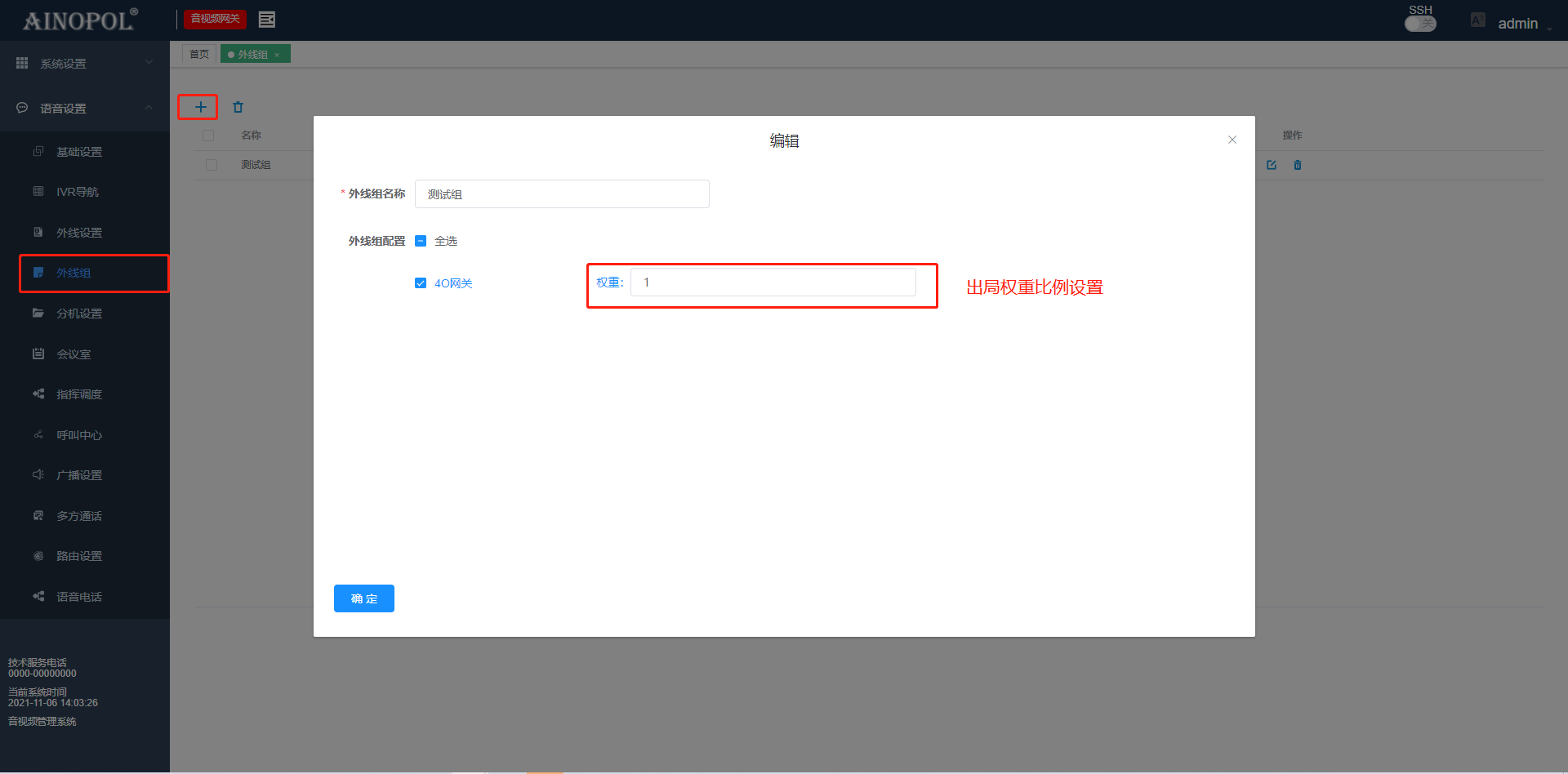 目录 搜索 光迅音视频网关简介如何登陆系统注:通过阿里云安装AVG系统话务台功能1.0 话务台使用向导1.1 主控台1.2 应急广播&夜服1.3 唤醒服务1.4 团队列表1.5 联系人1.6 分机管理1.7 唤醒记录1.8 通话CDR1.9 记事本1.10 黑名单常用功能介绍1、高级设置(强接、盲转、询问转、呼叫前转)2、广播IP喇叭背景音乐设置3、IVR导航设置(语音呼入导航)4、呼叫中心(短号直呼)群顺振一、系统设置1.1 网络设置1.1.1 聚合设置1.2 主机设置1.3 DHCP设置1.4 DNS服务1.5 系统工具1.5.1 简易抓包1.6 区域管理1.7 双机热备1.8 磁盘配置1.9 权限管理1.10 管理设置1.11 运行状态1.12 日志管理二、语音设置2.1 基础设置2.2 IVR导航2.3 外线设置2.4 外线组2.5 分机设置2.6 会议室2.8 呼叫中心( 短号直呼 )2.9 广播设置2.10 多方通话( IP分机具备免摘强制接听)2.11 路由设置2.12 唤醒服务2.13 语音服务2.14 通话CDR2.15 高级设置2.16 通讯录三、视频设置3.1 录制回看(维)3.2 国标设备3.2 推流列表(被动)3.3 拉流列表(主动)3.4 国际级联3.5 直播广场3.6 GB28181四、AISO 联动4.1 预案设置(号码触发)4.2 排队通知(定时播放音频)4.3 短信设置4.4 外部链接五、短信设置(维护)5.1 短信网关5.2 短信模板5.3 发送记录六、安全设置6.1 语音ACL6.2 安全策略6.3 IP黑白名单6.4 主叫黑名单(热门)七、指挥调度(热门)7.0 指挥调度开局说明( 推荐 )7.1 用户管理7.2 角色授权7.3 区域管理7.4 单元管理7.5 单元分类7.6 会议管理7.7 全局设置(地图)八、IOT管理(物联网设备)九、无线AC9.1 AP+管理9.2 网络模板9.3 定时重启9.4 AP+升级十、系统信息-系统升级 暂无相关搜索结果! 本文档由 智慧光迅 发布 2.4 外线组 外线组多条外线进行线路出局负载和权重比例设置文档更新时间: 2022-03-08 09:56 作者:admin