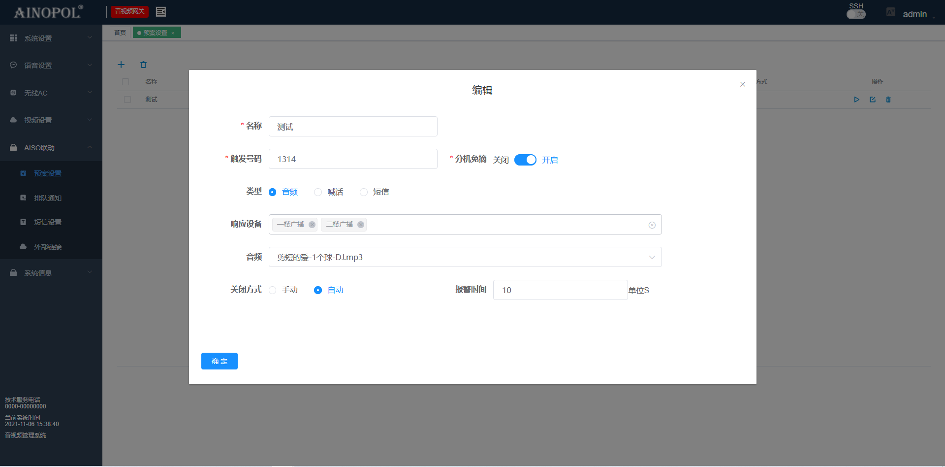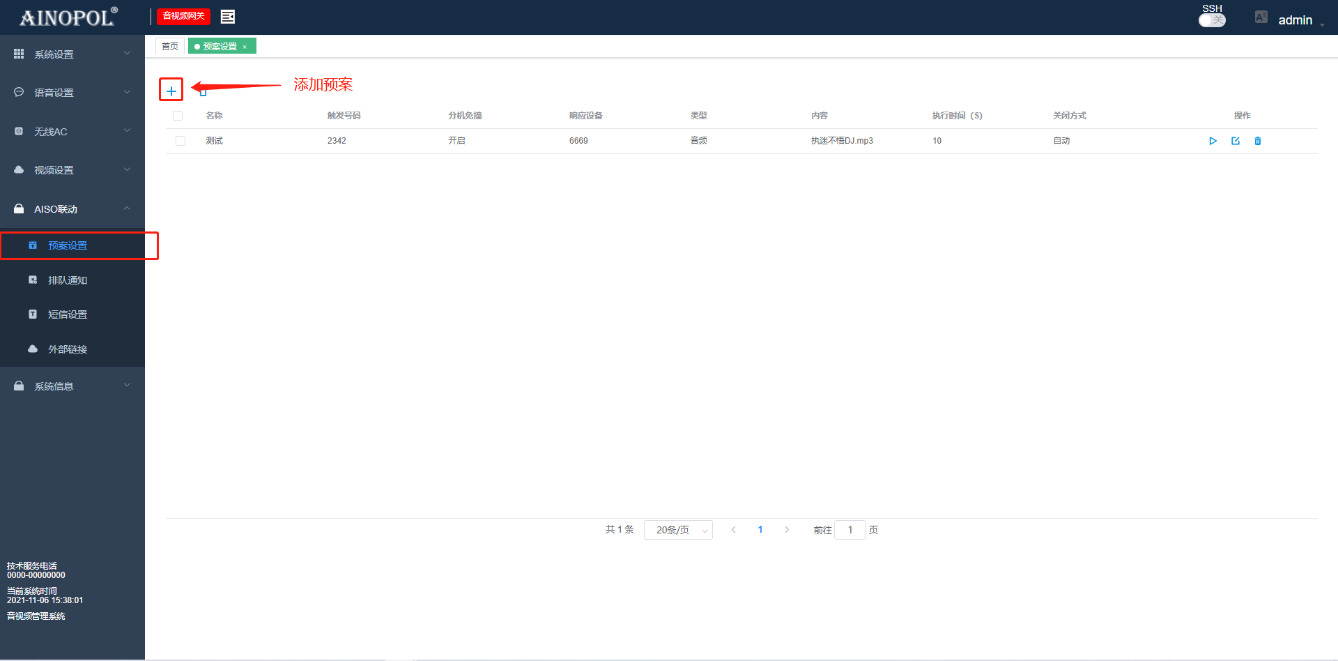 目录 搜索 光迅音视频网关简介如何登陆系统注:通过阿里云安装AVG系统话务台功能1.0 话务台使用向导1.1 主控台1.2 应急广播&夜服1.3 唤醒服务1.4 团队列表1.5 联系人1.6 分机管理1.7 唤醒记录1.8 通话CDR1.9 记事本1.10 黑名单常用功能介绍1、高级设置(强接、盲转、询问转、呼叫前转)2、广播IP喇叭背景音乐设置3、IVR导航设置(语音呼入导航)4、呼叫中心(短号直呼)群顺振一、系统设置1.1 网络设置1.1.1 聚合设置1.2 主机设置1.3 DHCP设置1.4 DNS服务1.5 系统工具1.5.1 简易抓包1.6 区域管理1.7 双机热备1.8 磁盘配置1.9 权限管理1.10 管理设置1.11 运行状态1.12 日志管理二、语音设置2.1 基础设置2.2 IVR导航2.3 外线设置2.4 外线组2.5 分机设置2.6 会议室2.8 呼叫中心( 短号直呼 )2.9 广播设置2.10 多方通话( IP分机具备免摘强制接听)2.11 路由设置2.12 唤醒服务2.13 语音服务2.14 通话CDR2.15 高级设置2.16 通讯录三、视频设置3.1 录制回看(维)3.2 国标设备3.2 推流列表(被动)3.3 拉流列表(主动)3.4 国际级联3.5 直播广场3.6 GB28181四、AISO 联动4.1 预案设置(号码触发)4.2 排队通知(定时播放音频)4.3 短信设置4.4 外部链接五、短信设置(维护)5.1 短信网关5.2 短信模板5.3 发送记录六、安全设置6.1 语音ACL6.2 安全策略6.3 IP黑白名单6.4 主叫黑名单(热门)七、指挥调度(热门)7.0 指挥调度开局说明( 推荐 )7.1 用户管理7.2 角色授权7.3 区域管理7.4 单元管理7.5 单元分类7.6 会议管理7.7 全局设置(地图)八、IOT管理(物联网设备)九、无线AC9.1 AP+管理9.2 网络模板9.3 定时重启9.4 AP+升级十、系统信息-系统升级 暂无相关搜索结果! 本文档由 智慧光迅 发布 4.1 预案设置(号码触发) 5.1 预案设置(号码触发)功能说明:触发号码 1314 (当1314号码呼叫 任意号码的时候,触发其他设备它们就会开始响铃) PS:需要拨号能打通的号码,例如打给前台,某一个房间号,外线呼出之类触发此音频播放'环境说明' 系统版本:C01V02R003P230414 效果说明:通过设置 A号码触发, 当A号码进行拨打电话时,就触发 其他分机号 出现某种行为5.1 预案设置(号码触发)功能说明:触发号码 1314 (当1314号码呼叫 任意号码的时候,触发其他设备它们就会开始响铃) PS:需要拨号能打通的号码,例如打给前台,某一个房间号,外线呼出之类触发此音频播放文档更新时间: 2023-04-19 14:21 作者:admin
