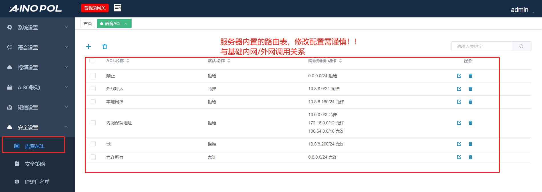 目录 搜索 光迅音视频网关简介如何登陆系统注:通过阿里云安装AVG系统话务台功能1.0 话务台使用向导1.1 主控台1.2 应急广播&夜服1.3 唤醒服务1.4 团队列表1.5 联系人1.6 分机管理1.7 唤醒记录1.8 通话CDR1.9 记事本1.10 黑名单常用功能介绍1、高级设置(强接、盲转、询问转、呼叫前转)2、广播IP喇叭背景音乐设置3、IVR导航设置(语音呼入导航)4、呼叫中心(短号直呼)群顺振一、系统设置1.1 网络设置1.1.1 聚合设置1.2 主机设置1.3 DHCP设置1.4 DNS服务1.5 系统工具1.5.1 简易抓包1.6 区域管理1.7 双机热备1.8 磁盘配置1.9 权限管理1.10 管理设置1.11 运行状态1.12 日志管理二、语音设置2.1 基础设置2.2 IVR导航2.3 外线设置2.4 外线组2.5 分机设置2.6 会议室2.8 呼叫中心( 短号直呼 )2.9 广播设置2.10 多方通话( IP分机具备免摘强制接听)2.11 路由设置2.12 唤醒服务2.13 语音服务2.14 通话CDR2.15 高级设置2.16 通讯录三、视频设置3.1 录制回看(维)3.2 国标设备3.2 推流列表(被动)3.3 拉流列表(主动)3.4 国际级联3.5 直播广场3.6 GB28181四、AISO 联动4.1 预案设置(号码触发)4.2 排队通知(定时播放音频)4.3 短信设置4.4 外部链接五、短信设置(维护)5.1 短信网关5.2 短信模板5.3 发送记录六、安全设置6.1 语音ACL6.2 安全策略6.3 IP黑白名单6.4 主叫黑名单(热门)七、指挥调度(热门)7.0 指挥调度开局说明( 推荐 )7.1 用户管理7.2 角色授权7.3 区域管理7.4 单元管理7.5 单元分类7.6 会议管理7.7 全局设置(地图)八、IOT管理(物联网设备)九、无线AC9.1 AP+管理9.2 网络模板9.3 定时重启9.4 AP+升级十、系统信息-系统升级 暂无相关搜索结果! 本文档由 智慧光迅 发布 6.1 语音ACL 1:语音ACL,是服务器内置写好的 安全控制2:语音ACL 调用在 ,在语音设置-基础设置- 内线&外线设置– 高级设置'环境说明' 系统版本:C01V02R003P2304141:语音ACL,是服务器内置写好的 安全控制2:语音ACL 调用在 ,在语音设置-基础设置- 内线&外线设置– 高级设置文档更新时间: 2023-05-26 15:19 作者:admin