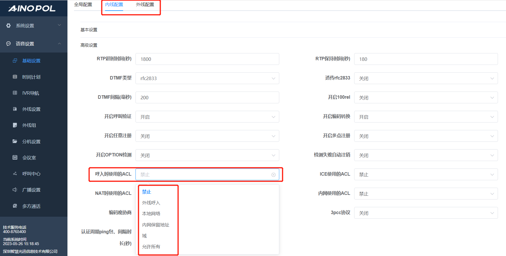 1:语音ACL,是服务器内置写好的 安全控制2:语音ACL 调用在 ,在语音设置-基础设置- 内线&外线设置– 高级设置'环境说明' 系统版本:C01V02R003P2304141:语音ACL,是服务器内置写好的 安全控制2:语音ACL 调用在 ,在语音设置-基础设置- 内线&外线设置– 高级设置文档更新时间: 2023-05-26 15:19 作者:admin