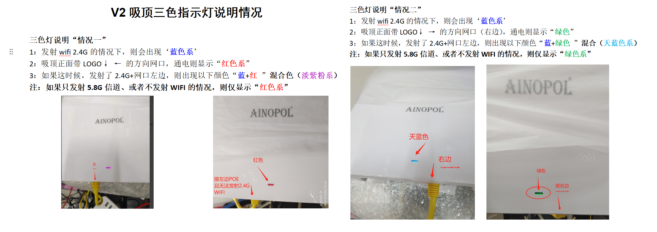 目录 搜索 一,EAAS-3.0 系统介绍二、注册EAAS账号查看分享项目三、创建项目并绑定对应设备(向导)3.1 通过项目查看所管理的设备四、已存在项目新增加设备五、使用EAAS搭建AC+AP环境部署六、主动分享/移交项目七、私密投屏搭建使用教程7.1 投屏扫码付费模式介绍八、网络配置(可选默认模板)九、广告业务-云享世界十、自定义TV-APP生成十一、VAP的使用介绍热门推荐:光AP模板下发推荐重:调试光AP&AP,注意事项一、ZH-F4225W 下发教程二、ZH-F412W 下发教程三、ZH-C4225W 下发教程(网线版)四、智慧光迅-面板AP-Trunk模式五、吸顶AP-V2型号指示灯介绍六、ZH-F8P&ZH-F8 下发教程七、ZH-F886W-下发教程八、EAAS平台光AP设备替换教程 暂无相关搜索结果! 本文档由 智慧光迅 发布 五、吸顶AP-V2型号指示灯介绍 V2吸顶三色指示灯说明情况文档更新时间: 2023-12-22 13:40 作者:admin