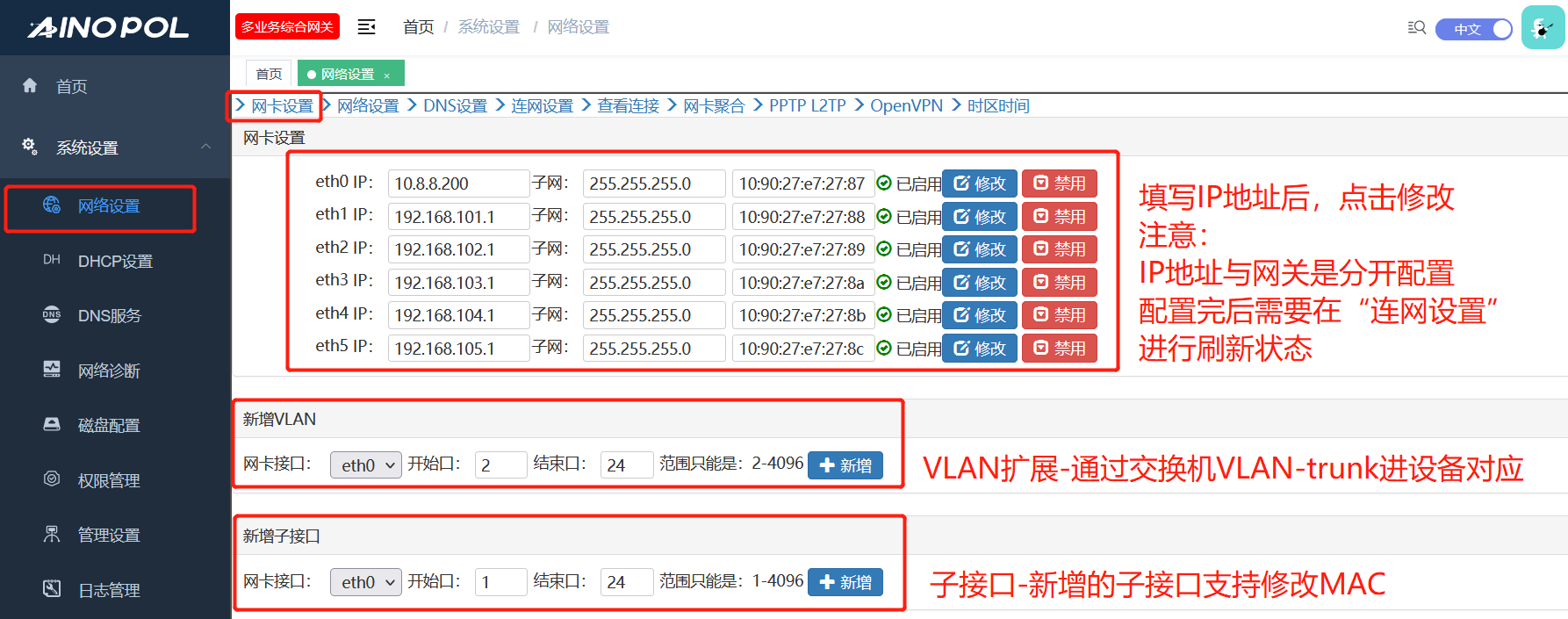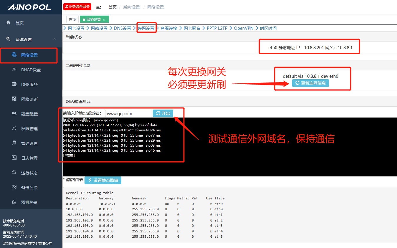- 1. 3 配置上网口对应网卡的网关、并进行是否连通外网测试