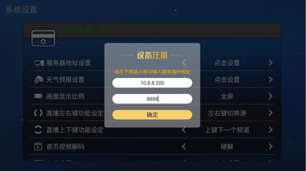 - 6.2 机顶盒进到首页验证界面,按遥控器上下上下 左右左右(↑↓↑↓←→←→)呼出设置主机号(服务器输出口),如果进入不到的情况下,等待5秒左右,然后再操作遥控器触发