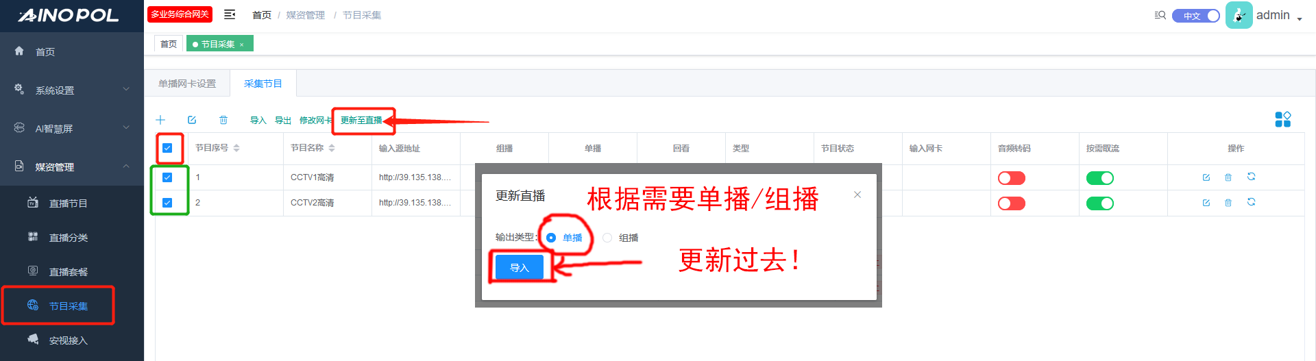 - 3.2 针对 采集成功的频道,或者是“按需取流”的,进行批量勾选,更新至“直播节目”