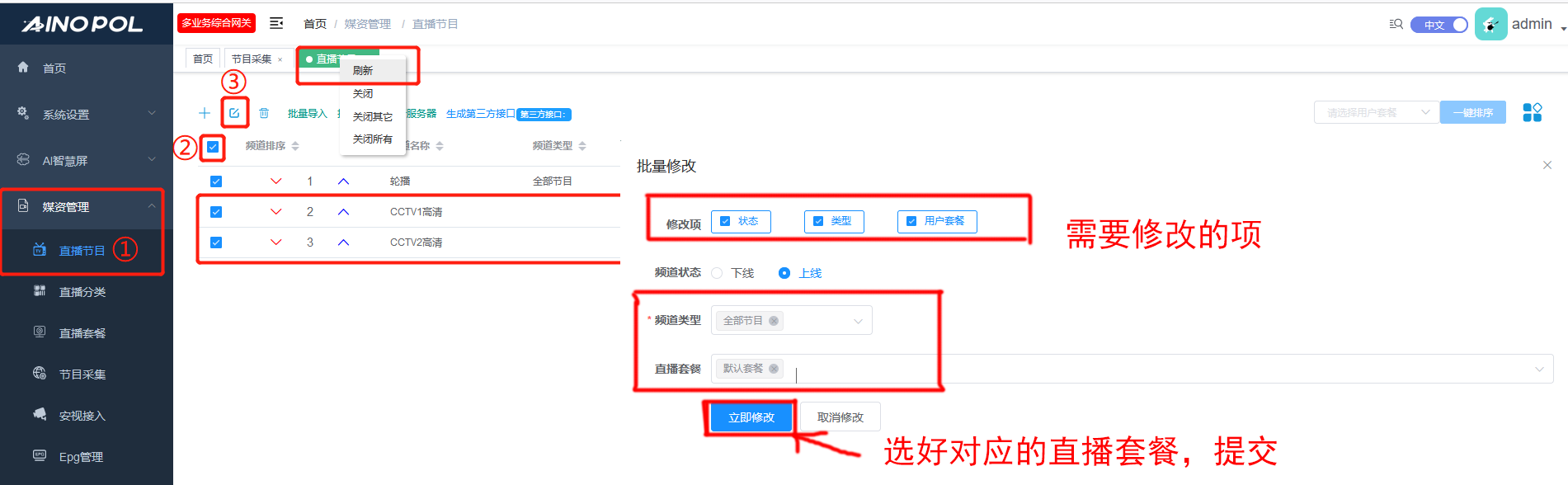 3.3 将对应的 直播频道, 批量编辑上架!! ( 隶属于 自己需要的对应套餐 )