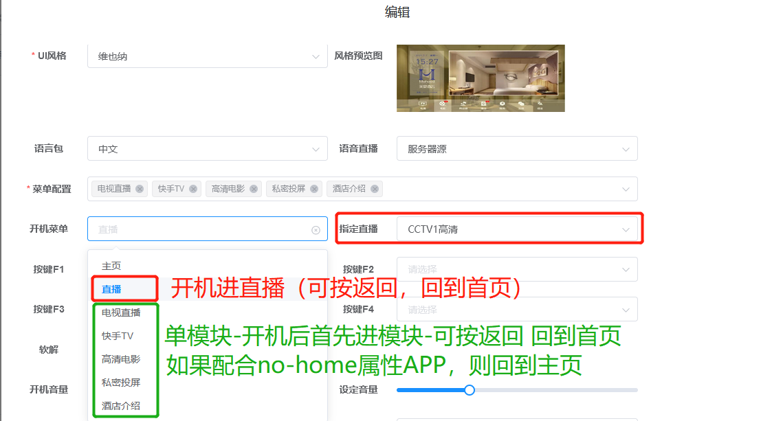 5.2.1:此处可以设置,指定直播节目、开机进直播、软解功能参数,设置UI界面