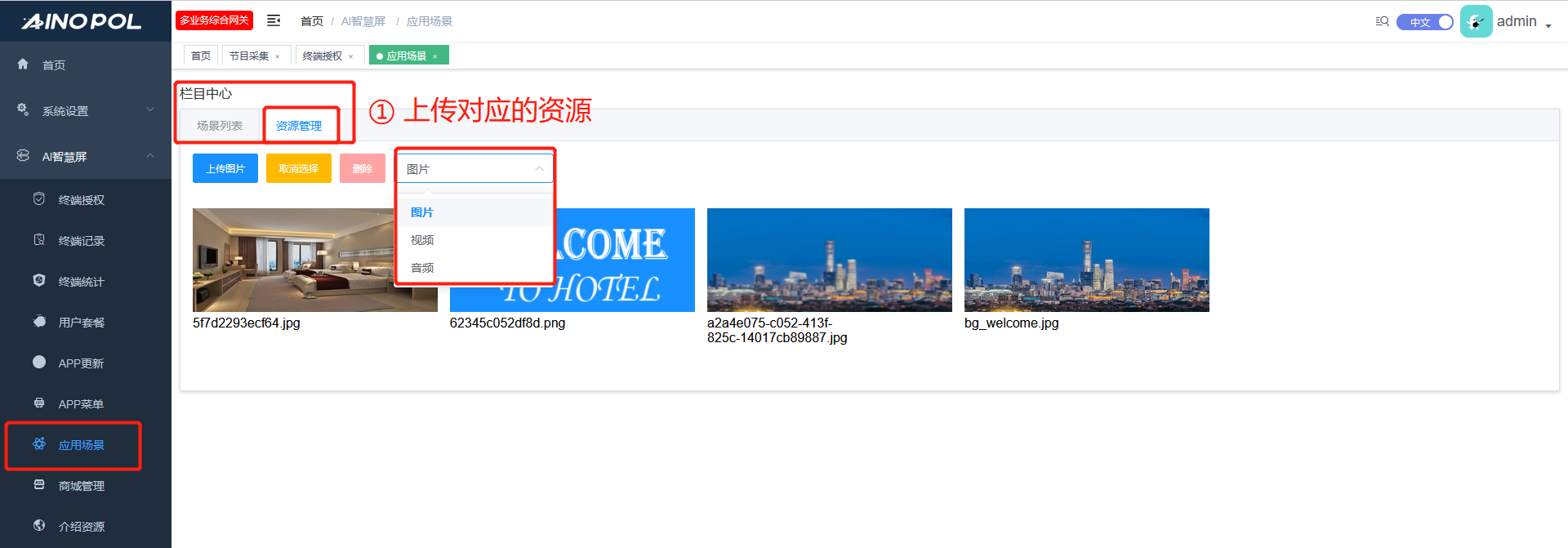 1:新多业务综合网关,采用的是 “资源管理” 方式,将对应的素材放到资源管理,再编辑场景选择需要的素材