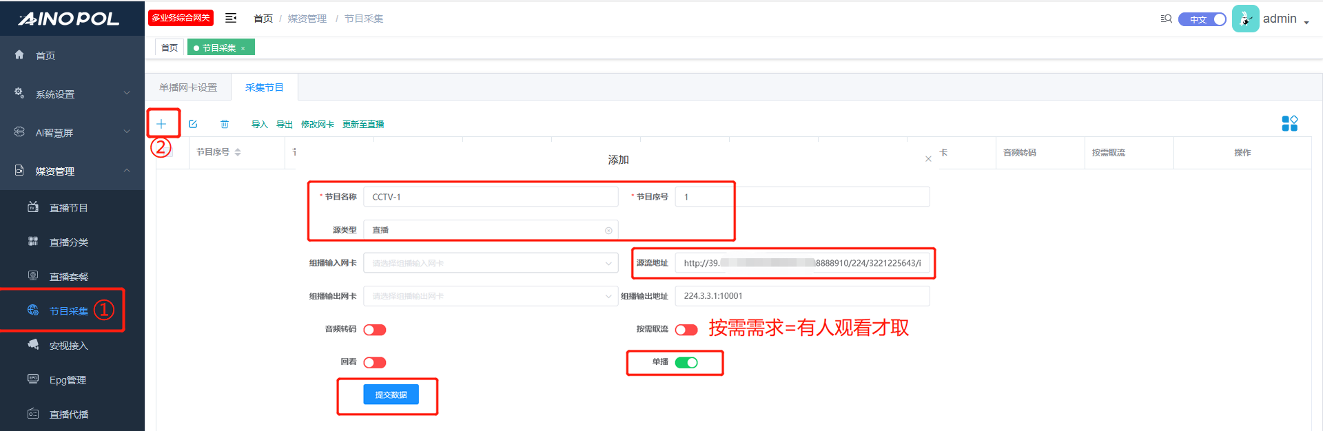 【1:采集运营商,运营商有单播源RTSP/HTTP、UDP等】