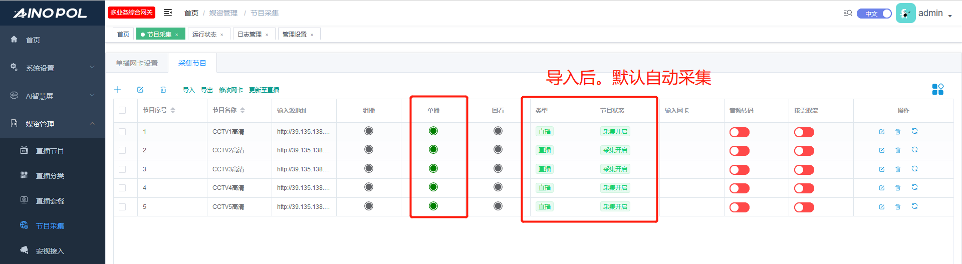 3.2 针对 采集成功的频道,或者是“按需取流”的,进行批量勾选,更新至“直播节目”