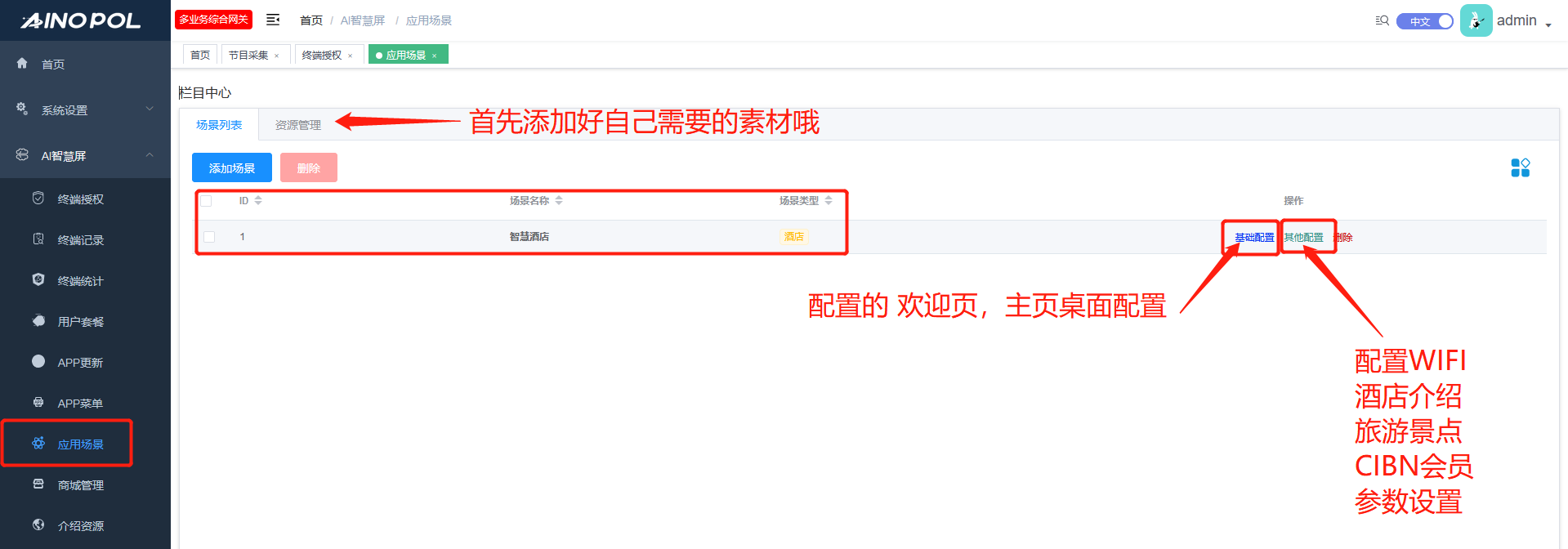 - 4.1 找到AI智慧屏、应用场景-首先进资源管理-编辑上传首页视频、图片、素材等等,然后进到基础设置