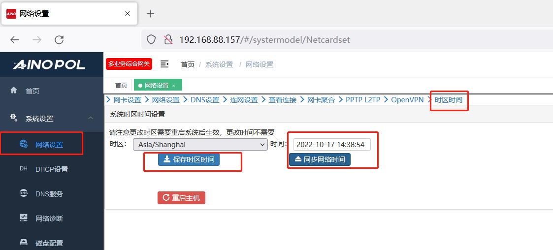 进来网络设置,时区设置查询,看当前的时间是否正常,同步下时间并保存