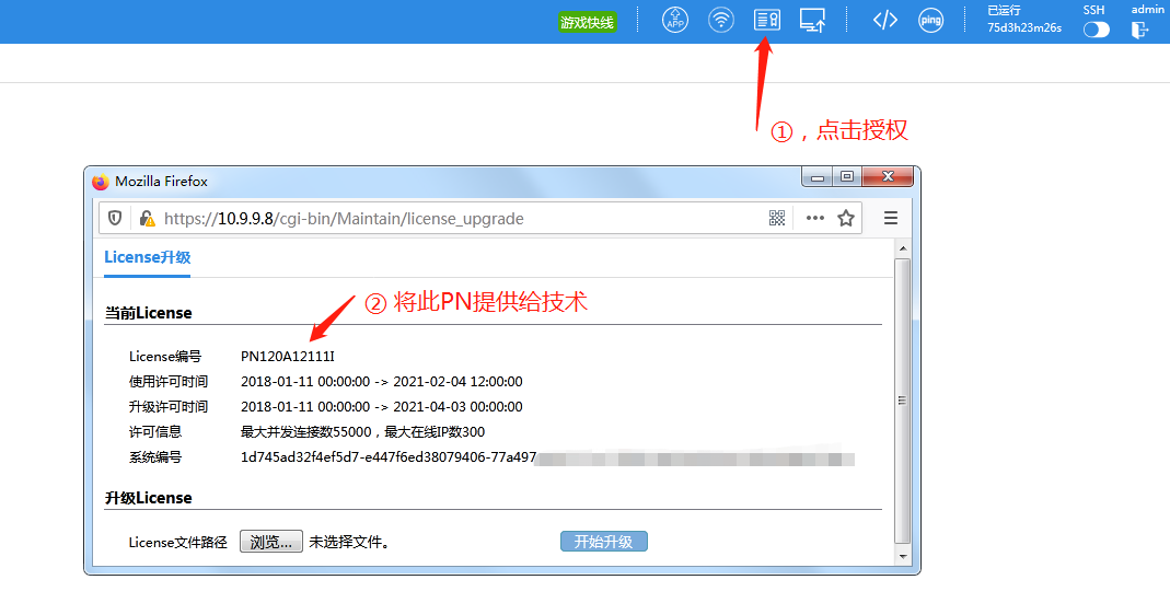 目录 搜索 智慧光迅简介寻找技术支持的产品提供授权途径图解 暂无相关搜索结果! 本文档由 智慧光迅 发布 寻找技术支持的产品提供授权途径图解 融合网关(注意私发给技术员)1:融合网关寻找技术支持提供授权码(注意私发给技术员)(登陆网页、产品信息、系统升级)智慧AC(AC路由一体)(注意私发给技术员)2:智慧AC路由器,登陆系统进入后,检测产品系列号提供北京派网Panabit(注意私发给技术员)3:登陆系统界面后,寻找系统名称、或上云的名称提供,其次还可以提供 授权码PN的方式寻找技术支持4:智慧-4E上云序列号(2020-5月以后供应的产品才支持云管理)融合网关(注意私发给技术员)1:融合网关寻找技术支持提供授权码(注意私发给技术员)(登陆网页、产品信息、系统升级)智慧AC(AC路由一体)(注意私发给技术员)2:智慧AC路由器,登陆系统进入后,检测产品系列号提供北京派网Panabit(注意私发给技术员)3:登陆系统界面后,寻找系统名称、或上云的名称提供,其次还可以提供 授权码PN的方式寻找技术支持4:智慧-4E上云序列号(2020-5月以后供应的产品才支持云管理)文档更新时间: 2020-06-03 17:37 作者:admin