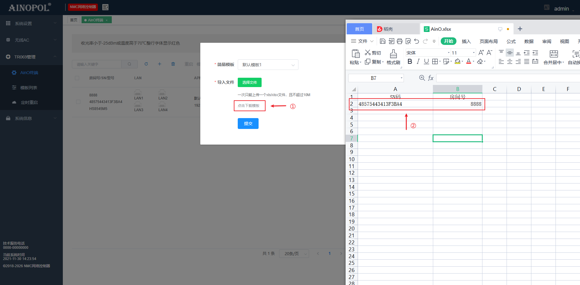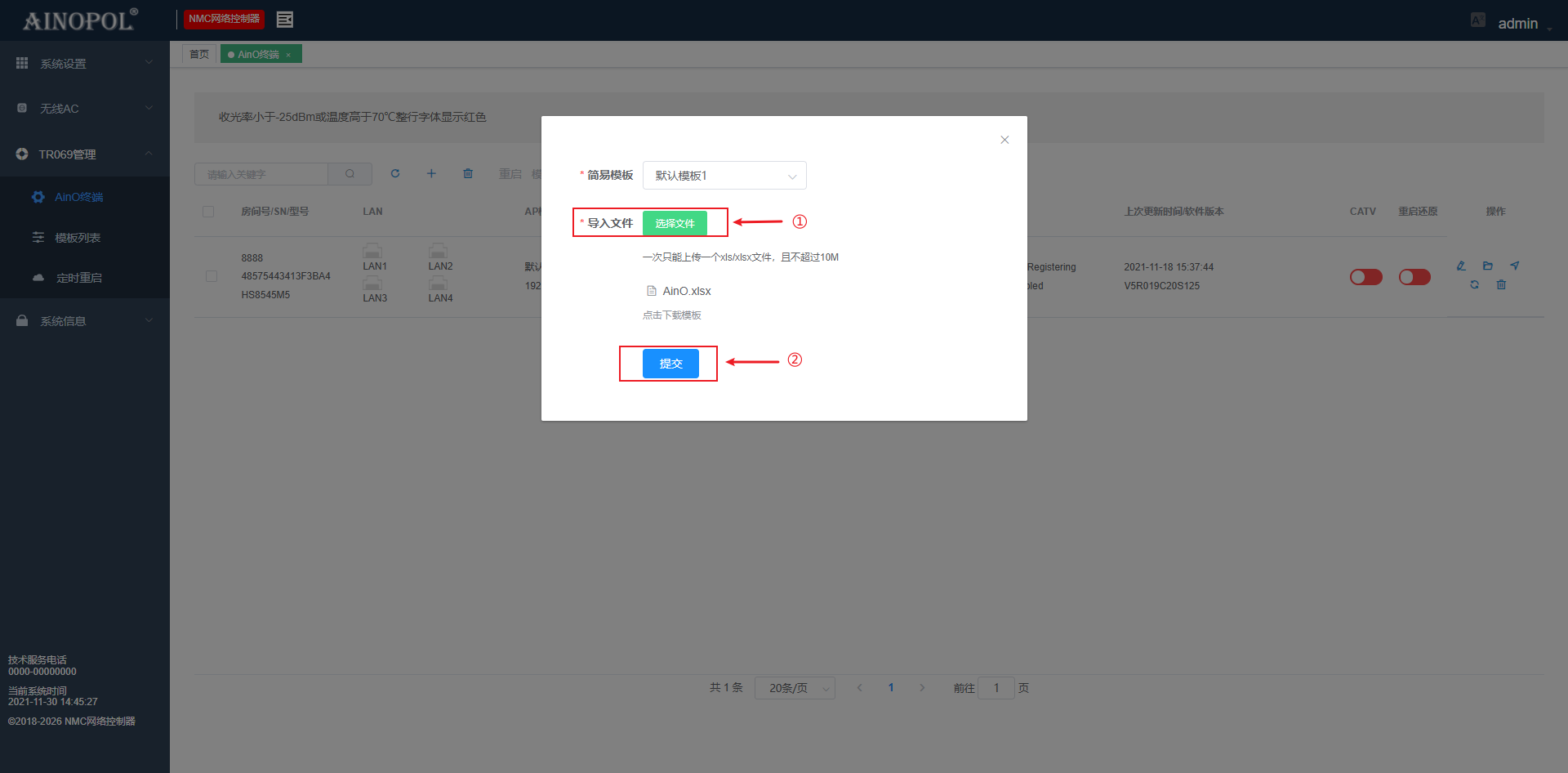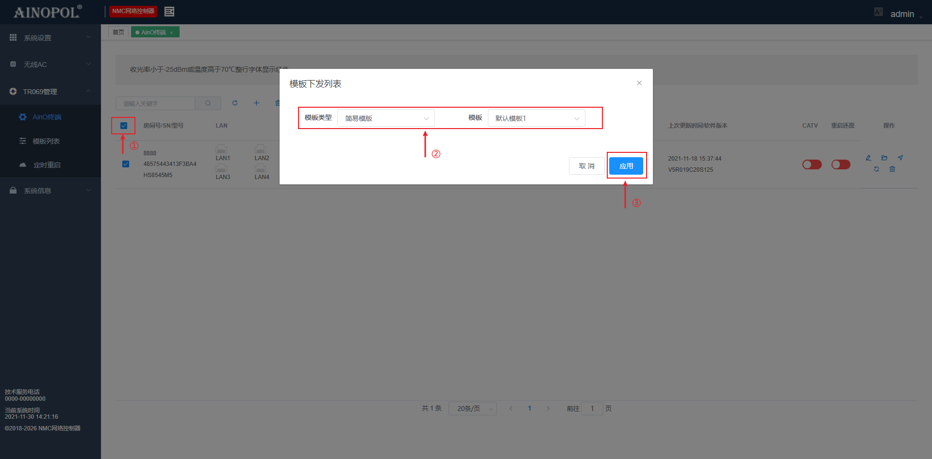 3.1 AINO终端①单个添加②填写SN③填写房间号 批量导入①下载模板②统计SN与房间号到模板 ①选择模板②提交数据进行导入 下发模板流程操作①选中要下发数据的光猫②选中模板③应用下发文档更新时间: 2021-11-30 14:53 作者:admin
