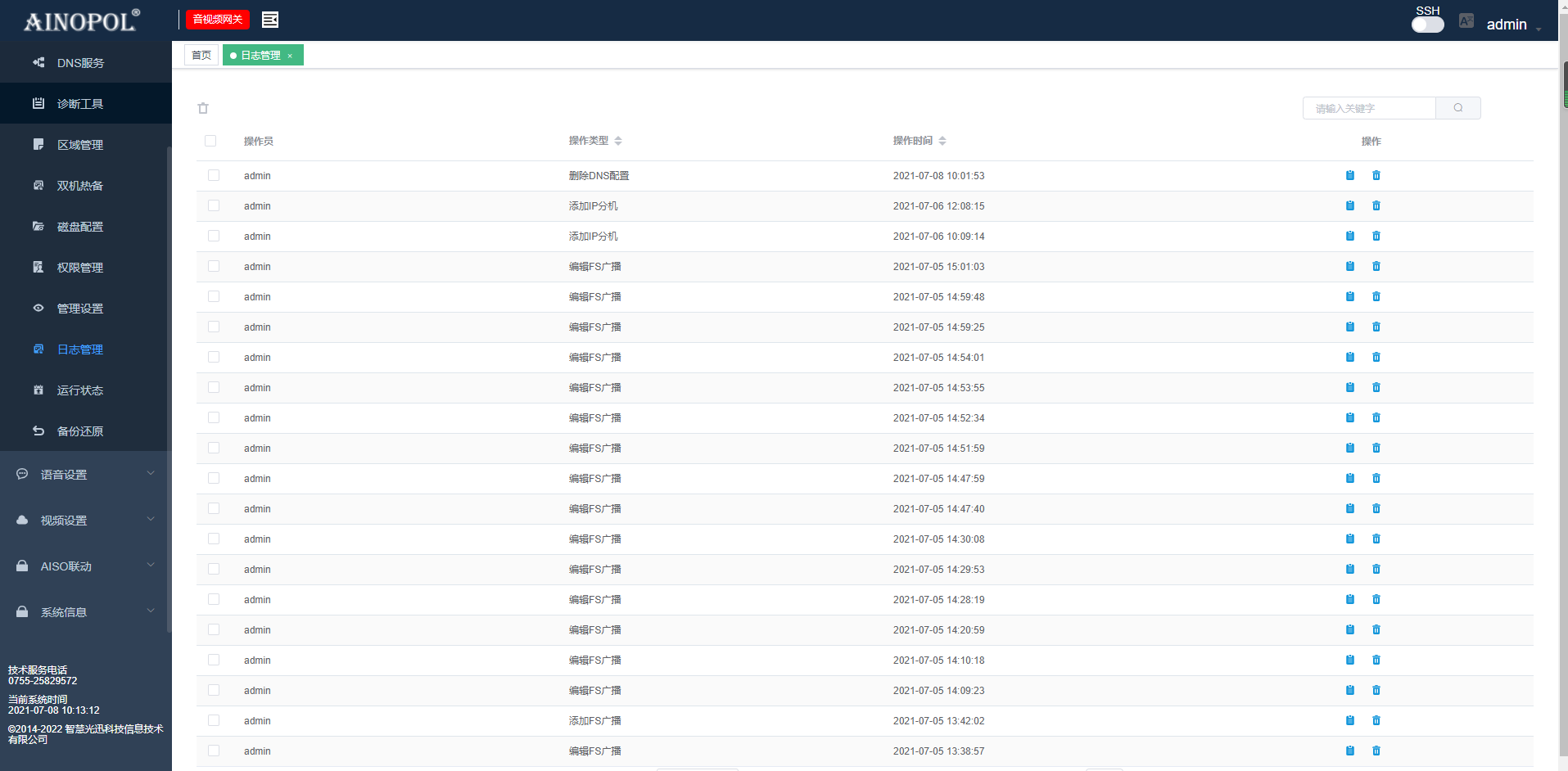 目录 搜索 常用功能介绍1、NMC与凌风计费对接1.系统设置1.1网络设置1.2 DHCP设置1.3 DNS服务1.4 诊断工具1.5 双机热备1.6 磁盘配置1.7 权限管理1.8 管理设置1.9 日志管理1.10 运行状态2.无线AC2.1 AP+管理2.2 网络模板2.3 定时重启2.4 AP+升级3.TR069管理3.1 AINO终端3.2 模板列表 暂无相关搜索结果! 本文档由 智慧光迅 发布 1.9 日志管理 本菜单查看相应账号操作日志:文档更新时间: 2021-12-04 09:35 作者:admin