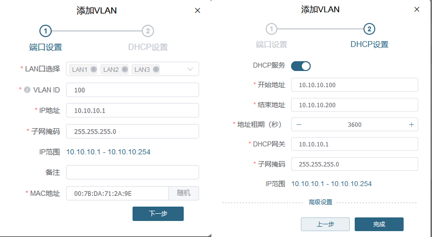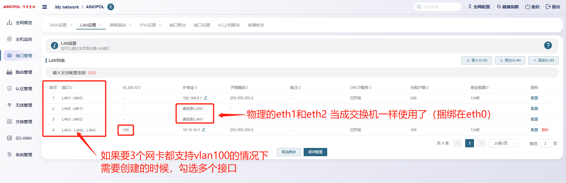 目录 搜索 目录介绍快速配置上网教程(入门推荐)注:系统常用功能设置1、直播代播功能V11.1 、直播代播V2(简易版)2、修改网页端口与Ping-WAN3、DNS解析劫持(本地AC-TR069)4、HTTP网页阻断5、DNS代理/无视终端静态DNS6、常用功能介绍7、通过SNMP跨三层获取MAC一、全网概览(首页)二、主机监控三、接口管理(LAN/WAN-策略分流)3.1 WAN设置与一线多拨3.2 WAN扩展接口VLAN3.3 LAN设置与VLAN-DHCP3.4 策略路由(根据协议分流)3.5 负载均衡(负载模式)3.6 端口聚合3.7 接口设置(控制LAN/WAN)四、路由设置(安全与行为管控)4.1 系统状态4.2 流控设置4.3 安全管理4.4 行为管控4.5 高级管理4.6 故障诊断与ping五、语音管理(安装向导)六、无线管理6.1 无线AC-推送终端升级七、视频CVR(安装向导)八、SD-WAN(虚拟区域网)九、系统管理(常用)9.1 访问设置( WAN访问 )9.2 配置管理9.3 设备重启(定时重启)9.4 系统升级 暂无相关搜索结果! 本文档由 智慧光迅 发布 3.3 LAN设置与VLAN-DHCP 1:编辑与添加,修改 LAN地址,添加VLAN扩展与IP地址分配( 注意如果是必须用 弹性模式例如eth1/eth2 需要与eth0 类似交换机工作模式,则创建VLAN的时候要勾选多个接口 )) 2:创建VLAN接口,和DHCP分配的时候( 注意 勾选随机MAC生成 )文档更新时间: 2022-09-12 21:37 作者:admin