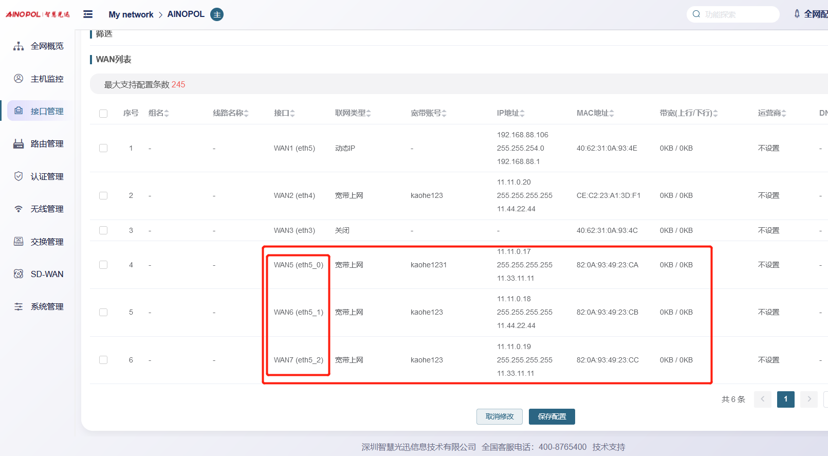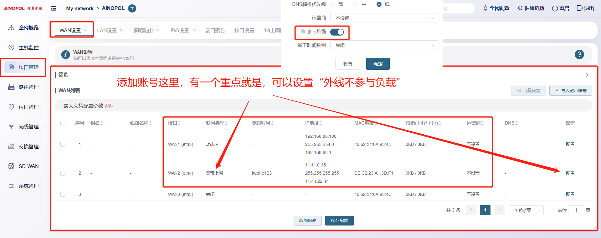 目录 搜索 目录介绍快速配置上网教程(入门推荐)注:系统常用功能设置1、直播代播功能V11.1 、直播代播V2(简易版)2、修改网页端口与Ping-WAN3、DNS解析劫持(本地AC-TR069)4、HTTP网页阻断5、DNS代理/无视终端静态DNS6、常用功能介绍7、通过SNMP跨三层获取MAC一、全网概览(首页)二、主机监控三、接口管理(LAN/WAN-策略分流)3.1 WAN设置与一线多拨3.2 WAN扩展接口VLAN3.3 LAN设置与VLAN-DHCP3.4 策略路由(根据协议分流)3.5 负载均衡(负载模式)3.6 端口聚合3.7 接口设置(控制LAN/WAN)四、路由设置(安全与行为管控)4.1 系统状态4.2 流控设置4.3 安全管理4.4 行为管控4.5 高级管理4.6 故障诊断与ping五、语音管理(安装向导)六、无线管理6.1 无线AC-推送终端升级七、视频CVR(安装向导)八、SD-WAN(虚拟区域网)九、系统管理(常用)9.1 访问设置( WAN访问 )9.2 配置管理9.3 设备重启(定时重启)9.4 系统升级 暂无相关搜索结果! 本文档由 智慧光迅 发布 3.1 WAN设置与一线多拨 1:默认添加WAN口的时候,可以添加为,静态IP/动态获取、PPPOE拨号等模式 ( 注,例如专线不需要加入负载的,可以“取消勾选参与负载” )2:接口管理、一线多拨,设置一线多拨状态开启,为接口添加 虚拟多3个接口出来3:给虚拟出来的3个接口,然后拨上账号( 创建后, 若初始拨号一直失败的情况下, 重启下路由系统 )4:如果要设置外线 “定时重播” ,编辑单个线路,高级设置,基于时间设置修改1:默认添加WAN口的时候,可以添加为,静态IP/动态获取、PPPOE拨号等模式 ( 注,例如专线不需要加入负载的,可以“取消勾选参与负载” )2:接口管理、一线多拨,设置一线多拨状态开启,为接口添加 虚拟多3个接口出来3:给虚拟出来的3个接口,然后拨上账号( 创建后, 若初始拨号一直失败的情况下, 重启下路由系统 )4:如果要设置外线 “定时重播” ,编辑单个线路,高级设置,基于时间设置修改文档更新时间: 2022-09-12 21:54 作者:admin