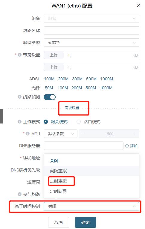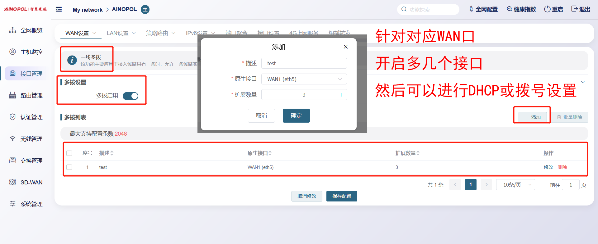 1:默认添加WAN口的时候,可以添加为,静态IP/动态获取、PPPOE拨号等模式 ( 注,例如专线不需要加入负载的,可以“取消勾选参与负载” )2:接口管理、一线多拨,设置一线多拨状态开启,为接口添加 虚拟多3个接口出来3:给虚拟出来的3个接口,然后拨上账号( 创建后, 若初始拨号一直失败的情况下, 重启下路由系统 )4:如果要设置外线 “定时重播” ,编辑单个线路,高级设置,基于时间设置修改1:默认添加WAN口的时候,可以添加为,静态IP/动态获取、PPPOE拨号等模式 ( 注,例如专线不需要加入负载的,可以“取消勾选参与负载” )2:接口管理、一线多拨,设置一线多拨状态开启,为接口添加 虚拟多3个接口出来3:给虚拟出来的3个接口,然后拨上账号( 创建后, 若初始拨号一直失败的情况下, 重启下路由系统 )4:如果要设置外线 “定时重播” ,编辑单个线路,高级设置,基于时间设置修改文档更新时间: 2022-09-12 21:54 作者:admin