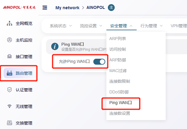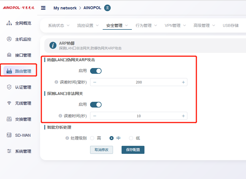 目录 搜索 目录介绍快速配置上网教程(入门推荐)注:系统常用功能设置1、直播代播功能V11.1 、直播代播V2(简易版)2、修改网页端口与Ping-WAN3、DNS解析劫持(本地AC-TR069)4、HTTP网页阻断5、DNS代理/无视终端静态DNS6、常用功能介绍7、通过SNMP跨三层获取MAC一、全网概览(首页)二、主机监控三、接口管理(LAN/WAN-策略分流)3.1 WAN设置与一线多拨3.2 WAN扩展接口VLAN3.3 LAN设置与VLAN-DHCP3.4 策略路由(根据协议分流)3.5 负载均衡(负载模式)3.6 端口聚合3.7 接口设置(控制LAN/WAN)四、路由设置(安全与行为管控)4.1 系统状态4.2 流控设置4.3 安全管理4.4 行为管控4.5 高级管理4.6 故障诊断与ping五、语音管理(安装向导)六、无线管理6.1 无线AC-推送终端升级七、视频CVR(安装向导)八、SD-WAN(虚拟区域网)九、系统管理(常用)9.1 访问设置( WAN访问 )9.2 配置管理9.3 设备重启(定时重启)9.4 系统升级 暂无相关搜索结果! 本文档由 智慧光迅 发布 4.3 安全管理 1:ARP防御设置 ( 避免避免内网ARP攻击, 检测探测是否内网有恶意非法网关 ) 2:访问控制列表( 可以控制内网某一些网段,或某一些IP地址 不允许上网 ,可根据时间控制 ) 3:MAC访问控制( 有黑名单/ 白名单的区别,注意使用方式 ) 4:连接数控制,可以限制单IP总连接数,或者某一些网段限制 5:ping-WAN口允许文档更新时间: 2022-10-03 16:47 作者:admin