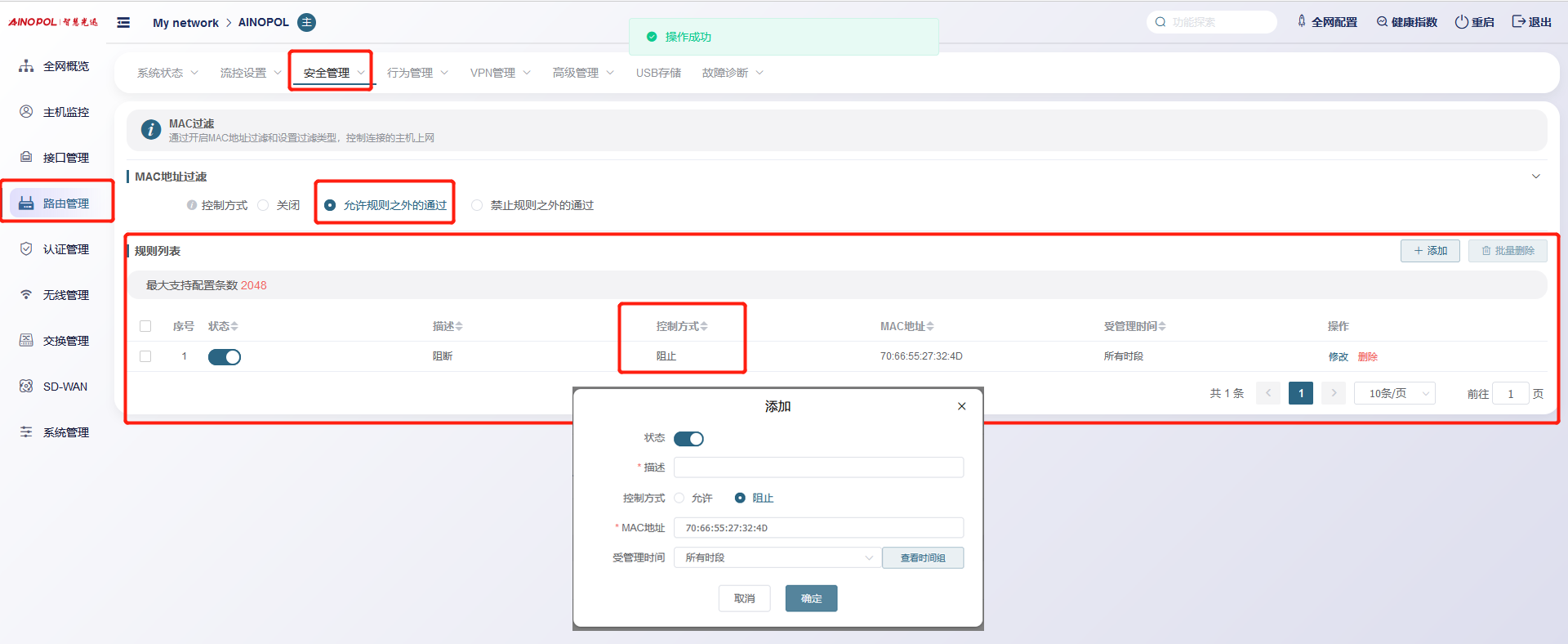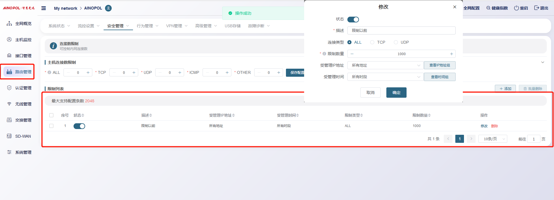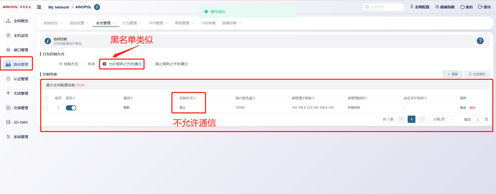 1:ARP防御设置 ( 避免避免内网ARP攻击, 检测探测是否内网有恶意非法网关 ) 2:访问控制列表( 可以控制内网某一些网段,或某一些IP地址 不允许上网 ,可根据时间控制 ) 3:MAC访问控制( 有黑名单/ 白名单的区别,注意使用方式 ) 4:连接数控制,可以限制单IP总连接数,或者某一些网段限制 5:ping-WAN口允许文档更新时间: 2022-10-03 16:47 作者:admin