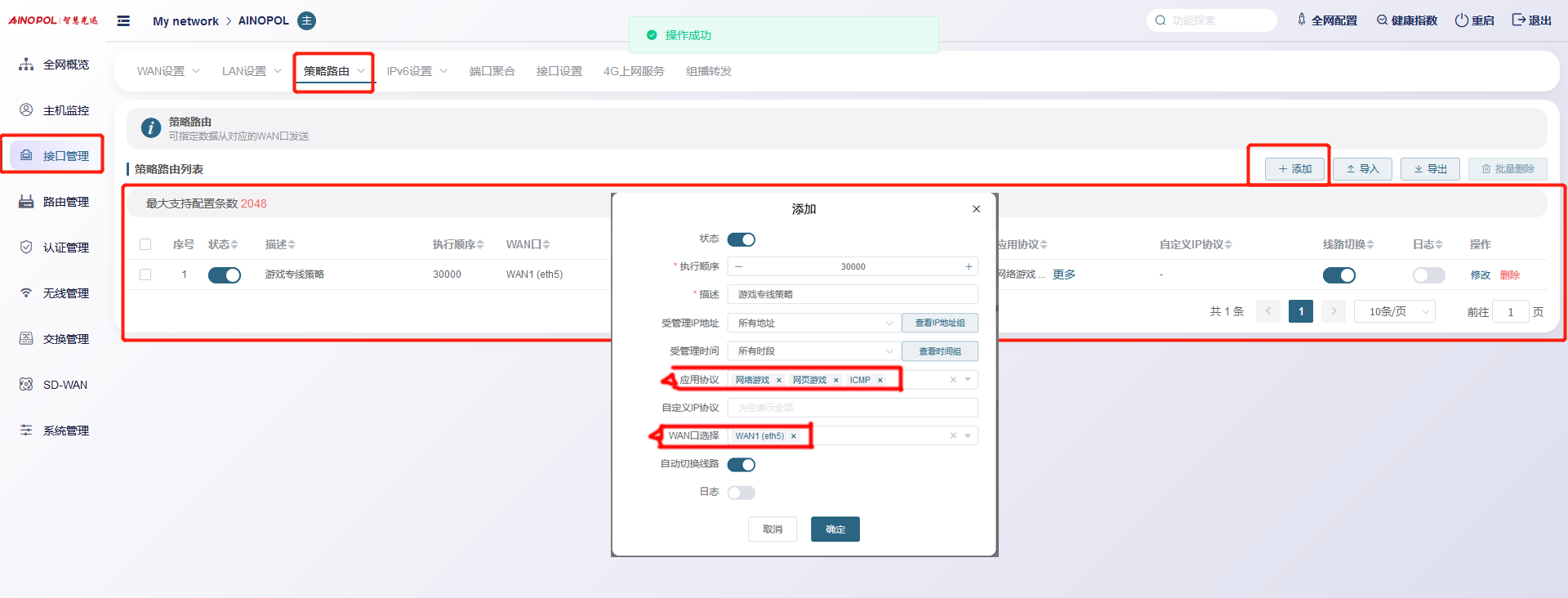 目录 搜索 目录介绍快速配置上网教程(入门推荐)注:系统常用功能设置1、直播代播功能V11.1 、直播代播V2(简易版)2、修改网页端口与Ping-WAN3、DNS解析劫持(本地AC-TR069)4、HTTP网页阻断5、DNS代理/无视终端静态DNS6、常用功能介绍7、通过SNMP跨三层获取MAC一、全网概览(首页)二、主机监控三、接口管理(LAN/WAN-策略分流)3.1 WAN设置与一线多拨3.2 WAN扩展接口VLAN3.3 LAN设置与VLAN-DHCP3.4 策略路由(根据协议分流)3.5 负载均衡(负载模式)3.6 端口聚合3.7 接口设置(控制LAN/WAN)四、路由设置(安全与行为管控)4.1 系统状态4.2 流控设置4.3 安全管理4.4 行为管控4.5 高级管理4.6 故障诊断与ping五、语音管理(安装向导)六、无线管理6.1 无线AC-推送终端升级七、视频CVR(安装向导)八、SD-WAN(虚拟区域网)九、系统管理(常用)9.1 访问设置( WAN访问 )9.2 配置管理9.3 设备重启(定时重启)9.4 系统升级 暂无相关搜索结果! 本文档由 智慧光迅 发布 3.4 策略路由(根据协议分流) 1:实际实际情况, 如果资源有专线的话,我们优先将 游戏/网银/icmp/微信等即使协议进行分流指派!! ( 如果勾选 “自动切换线路”的情况下,则为 当指定的线路故障的时候,自动切换成其他正常的线路走 )文档更新时间: 2022-09-12 21:47 作者:admin