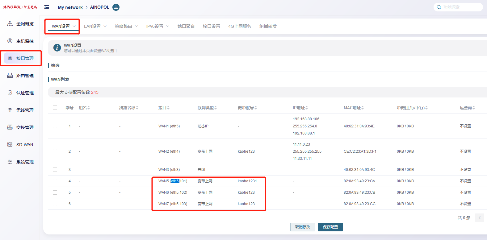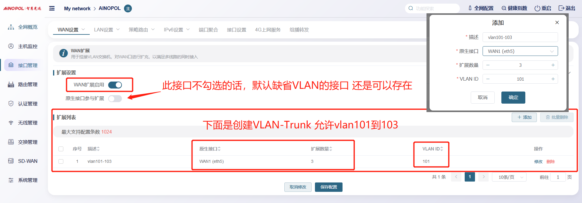 目录 搜索 目录介绍快速配置上网教程(入门推荐)注:系统常用功能设置1、直播代播功能V11.1 、直播代播V2(简易版)2、修改网页端口与Ping-WAN3、DNS解析劫持(本地AC-TR069)4、HTTP网页阻断5、DNS代理/无视终端静态DNS6、常用功能介绍7、通过SNMP跨三层获取MAC一、全网概览(首页)二、主机监控三、接口管理(LAN/WAN-策略分流)3.1 WAN设置与一线多拨3.2 WAN扩展接口VLAN3.3 LAN设置与VLAN-DHCP3.4 策略路由(根据协议分流)3.5 负载均衡(负载模式)3.6 端口聚合3.7 接口设置(控制LAN/WAN)四、路由设置(安全与行为管控)4.1 系统状态4.2 流控设置4.3 安全管理4.4 行为管控4.5 高级管理4.6 故障诊断与ping五、语音管理(安装向导)六、无线管理6.1 无线AC-推送终端升级七、视频CVR(安装向导)八、SD-WAN(虚拟区域网)九、系统管理(常用)9.1 访问设置( WAN访问 )9.2 配置管理9.3 设备重启(定时重启)9.4 系统升级 暂无相关搜索结果! 本文档由 智慧光迅 发布 3.2 WAN扩展接口VLAN 1:WAN设置, 开启WAN扩展启用 ( 划分VLAN出来,案例是vlan101到103 ) 2:检测下扩展VLAN的数据情况( vlan101到103 可以单独设置 )文档更新时间: 2022-09-12 21:21 作者:admin