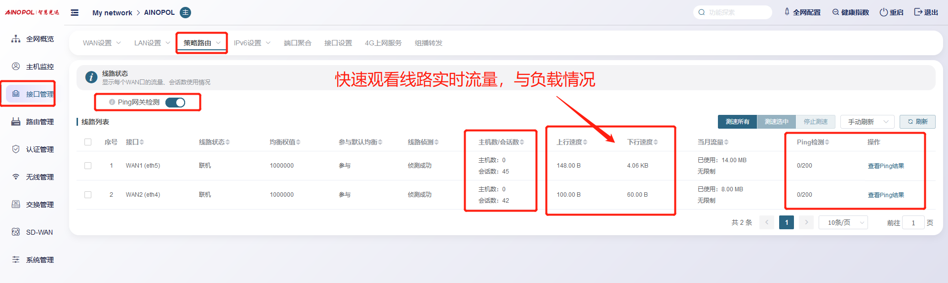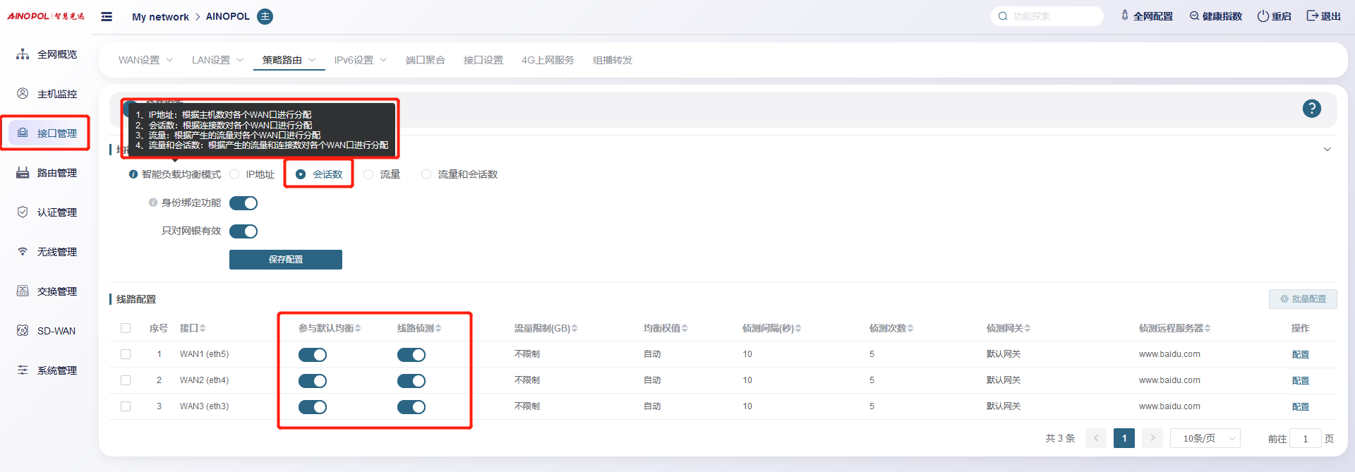 1:推荐使用“会话数” 方式负载模式 根据连接数负载 ,同时此处支持快速编辑,某一些线路不需要负载IP地址:根据主机数对各个WAN口进行分配会话数:根据连接数对各个WAN口进行分配流量:根据产生的流量对各个WAN口进行分配流量和会话数:根据产生的流量和连接数对各个WAN口进行分配 2:线路状态,快速分析文档更新时间: 2022-09-12 21:59 作者:admin