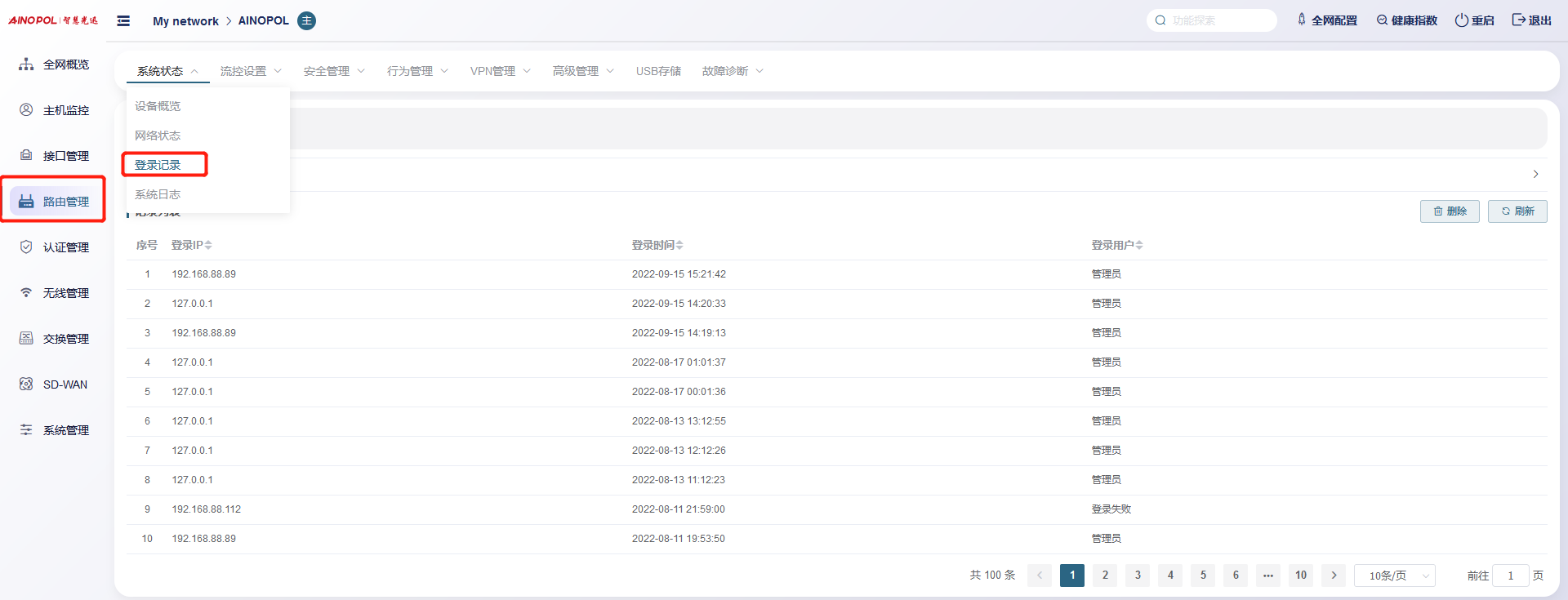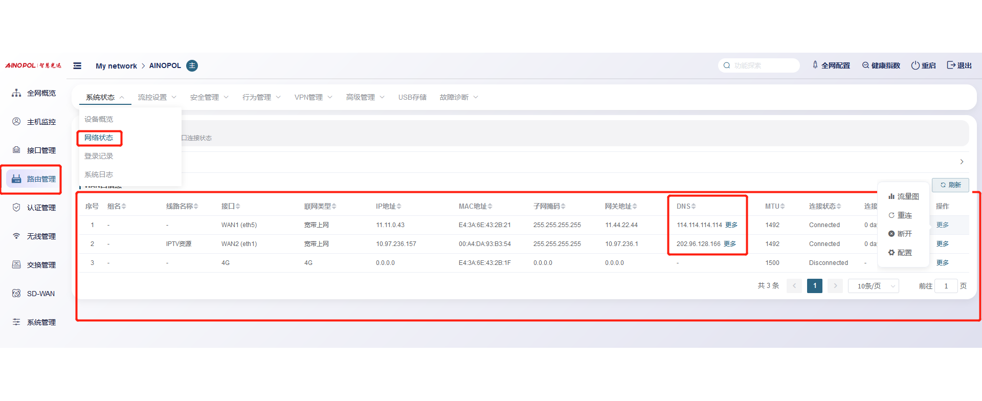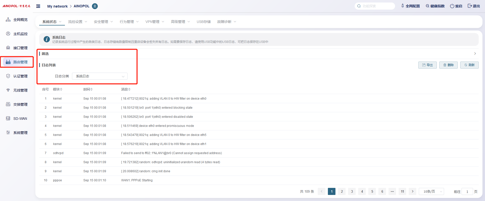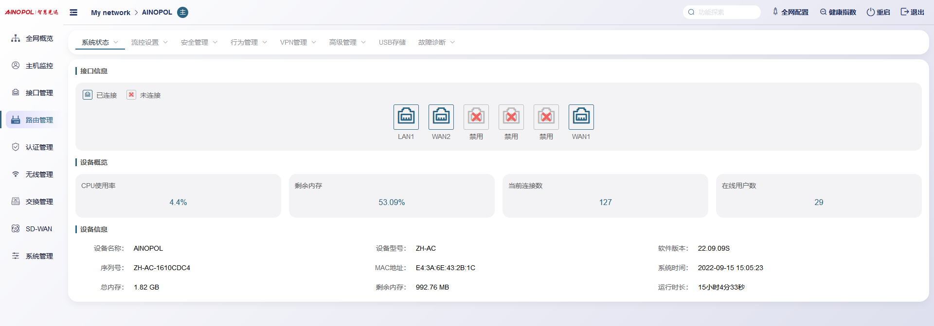 目录 搜索 目录介绍快速配置上网教程(入门推荐)注:系统常用功能设置1、直播代播功能V11.1 、直播代播V2(简易版)2、修改网页端口与Ping-WAN3、DNS解析劫持(本地AC-TR069)4、HTTP网页阻断5、DNS代理/无视终端静态DNS6、常用功能介绍7、通过SNMP跨三层获取MAC一、全网概览(首页)二、主机监控三、接口管理(LAN/WAN-策略分流)3.1 WAN设置与一线多拨3.2 WAN扩展接口VLAN3.3 LAN设置与VLAN-DHCP3.4 策略路由(根据协议分流)3.5 负载均衡(负载模式)3.6 端口聚合3.7 接口设置(控制LAN/WAN)四、路由设置(安全与行为管控)4.1 系统状态4.2 流控设置4.3 安全管理4.4 行为管控4.5 高级管理4.6 故障诊断与ping五、语音管理(安装向导)六、无线管理6.1 无线AC-推送终端升级七、视频CVR(安装向导)八、SD-WAN(虚拟区域网)九、系统管理(常用)9.1 访问设置( WAN访问 )9.2 配置管理9.3 设备重启(定时重启)9.4 系统升级 暂无相关搜索结果! 本文档由 智慧光迅 发布 4.1 系统状态 1:系统状态,快速分析看 服务器的接口状态,与CPU、内存消耗, 温度等 2:通过网络状态,快速分析 外网拨号成功的IP地址与掩码,和运营商提供的DNS参数( 右边可以点击立即重播 ) 3:登陆日志查询 4:系统日志查询文档更新时间: 2022-10-03 16:47 作者:admin