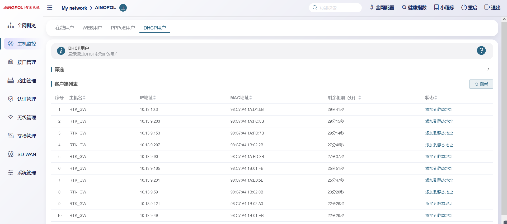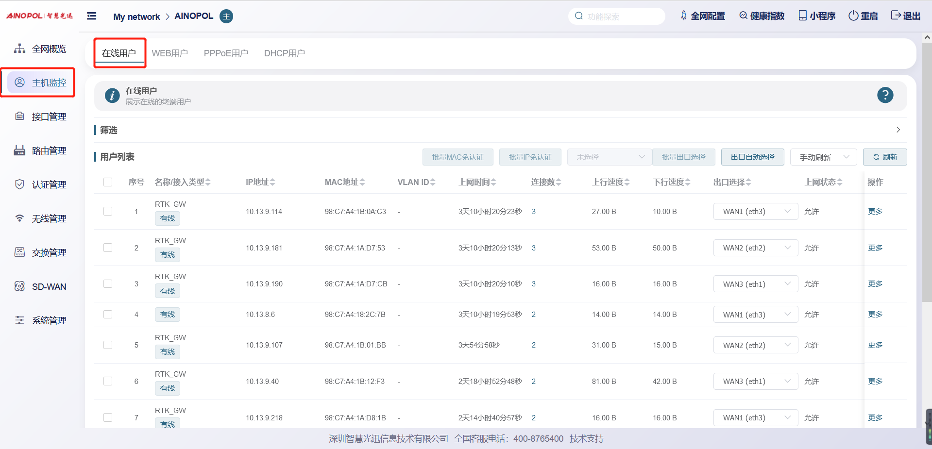 目录 搜索 目录介绍快速配置上网教程(入门推荐)注:系统常用功能设置1、直播代播功能V11.1 、直播代播V2(简易版)2、修改网页端口与Ping-WAN3、DNS解析劫持(本地AC-TR069)4、HTTP网页阻断5、DNS代理/无视终端静态DNS6、常用功能介绍7、通过SNMP跨三层获取MAC一、全网概览(首页)二、主机监控三、接口管理(LAN/WAN-策略分流)3.1 WAN设置与一线多拨3.2 WAN扩展接口VLAN3.3 LAN设置与VLAN-DHCP3.4 策略路由(根据协议分流)3.5 负载均衡(负载模式)3.6 端口聚合3.7 接口设置(控制LAN/WAN)四、路由设置(安全与行为管控)4.1 系统状态4.2 流控设置4.3 安全管理4.4 行为管控4.5 高级管理4.6 故障诊断与ping五、语音管理(安装向导)六、无线管理6.1 无线AC-推送终端升级七、视频CVR(安装向导)八、SD-WAN(虚拟区域网)九、系统管理(常用)9.1 访问设置( WAN访问 )9.2 配置管理9.3 设备重启(定时重启)9.4 系统升级 暂无相关搜索结果! 本文档由 智慧光迅 发布 二、主机监控 1、在线用户、web用户、PPPOE用户( 用户展示 ) 2、DHCP用户( 查看DHCP分配的IP地址 )文档更新时间: 2022-09-12 20:27 作者:admin