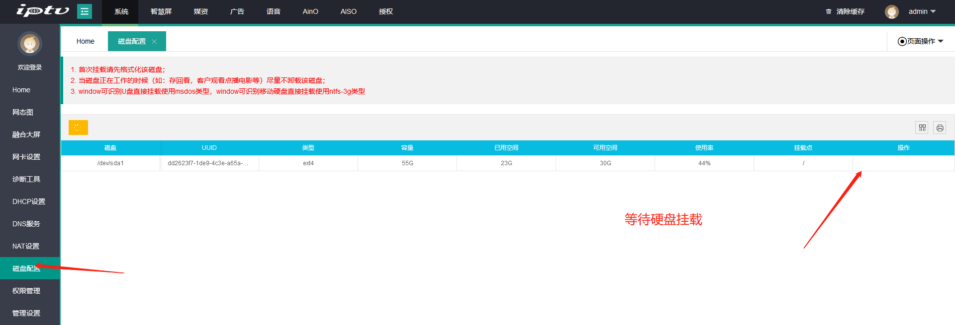 目录 搜索 一,系统简介↑ 点击支持模糊搜索 ↑二,系统的硬件配置和安装综合网关系统下载链接2.1 系统的硬件配置2.2 系统的安装2.2.1 制作系统安装U盘2.2.2 系统的安装步骤2.2.3 控制台配置管理地址教程2.2.4 重装系统后换机的流程三,系统常用功能设置3.1 设置向导教程流程(入门推荐)3.2 简单酒店、测试环境拓扑图3.3 配置应用中心整合应用APP3.3.1 应用中心V23.4 同步与添加第三方APP教程3.5 卸载、安装APP软件教程3.6 单终端测试新版本APK教程3.7 通过当贝市场安装U盘软件3.8 盒子热点跟随房间号自动生成3.9 创建多用户套餐、直播套餐对应3.10 导出直播节目重新排序顺序3.11 定时任务、定时重启流媒体3.12 修改终端天气预报地区3.13 广播寻址服务器IP免注册3.14 使用雷电模拟器测试后台效果3.15 使用PotPlayer测试节目列表(批量)3.16 终端到期提醒立即通知四,常见问题处理4.1 终端桌面数据无图标无背景4.2 快速判断节目是否采集正常4.3 服务器输出单播经过路由卡顿4.4 终端分辨率显示异常溺出修复4.5 闪雷80S下载慢无电影更新4.6 通过电脑VLC测试服务器输出4.7 UDP采集节目花屏处理4.8 看节目有画面无音频无声音4.9 直播无节目提示更新列表处理5.0 测试节目采集不到(各种情况)5.1 不显示欢迎页时效5.2 首页APP重复安装无法打开五,系统管理5.1 网态图5.2 网卡设置5.2.1 网卡设置(VLAN)5.2.2 拨号设置5.2.3 查看连接5.2.4 连网设置5.2.5 端口聚合(端口汇聚)5.3 诊断工具5.4 DHCP 5.5 NAT5.6 存储磁盘配置5.7 管理员设置(先创建权限)5.7.1 二级管理员首页链接5.8 权限管理5.9 日志管理5.10 运行状态5.11 备份还原5.11.1 备份下载与上传5.11.2 双机热备配置5.12 服务器配置(输出口)5.12.1 时移无法观看问题处理5.13 外部接口5.13.1 PMS接口后台服务器参数配置5.14 APP联动(通话音量变小)5.15 DNS服务【案例劫持】六,智慧屏6.1 终端授权6.1.1 免认证6.1.2 单个终端授权6.1.3 单个终端更换风格6.1.4 单个终端开软解6.1.5 终端远程控制操作6.1.6 终端卸载APP与安装APP6.1.7 未注册客户与到期用户6.1.8 终端故障换机步骤说明6.1.9 弹窗通知与紧急通知6.2 终端记录(通知、远程、服务)6.3 终端统计6.4 用户套餐6.4.1 套餐风格同步设置6.4.2 增加用户套餐6.4.3 添加语言包6.4.4 开机自动进入直播6.4.5 指定直播频道(每次)6.4.6 软解功能、托管逃生6.4.7 开机指定音量(root权限)6.5 APP更新6.5.1 APP更新6.5.2 全部升级6.5.3 按套餐升级6.5.4 停止升级6.6 APP菜单6.6.1 添加新APP、同步商城6.6.2 上传第三方APP6.6.3 APP排序6.6.4 视图109-打开指定网页6.6.5 强制升级第三方APP推送6.7 应用场景6.7.1 酒店场景配置6.7.1.1 酒店介绍V4/V5版本6.7.1.2 酒店宣传介绍图片(旅游景点、美食推荐、本地特产)6.7.2 小区场景配置6.7.2.1 小区终端到期提醒6.7.3 上传首页视频6.7.4 配置应用中心6.7.5 酒店房价牌6.7.6 医院场景6.7.6.1 医师介绍配置6.8 商城管理6.8.1 商品列表6.8.2 商品分类6.8.3 商品订单6.8.4 通用设置(商城背景电话)6.9 定时任务(系统→ 定时任务)6.9.1 直播视频定时插播任务6.9.2 定时终端开机关机(盒子等)6.9.3 定时重启采集流媒体6.9.4 终端管理(安装与卸载)6.9.5 定时清空APP缓存空间(常用)6.9.6 定时终端ADB命令任务6.9.7 定时重启AINO终端6.10 外部接口(PMS)6.11 其他介绍6.11.1 介绍列表6.11.2 介绍分类6.12 保险柜(防非房)(裁剪无法使用)6.13 设备绑定(语音对接)6.14 留言板6.15 易模板七,直播管理(媒资)7.1 直播节目7.1.1 直播节目添加7.1.2 直播节目编辑7.1.2.1 多节目源添加方式(双源)7.1.2.2 回看状态开启7.1.2.3 节目批量编辑7.1.3 直播节目上线与下线7.1.4 直播节目批量导入导出7.1.5 节目排序与一键排序7.1.6 回看服务器7.1.7 直播节目加密7.2 直播分类7.3 直播套餐7.4 节目采集7.4.1 添加与导入导出采集节目7.4.2 采集单播节目7.4.3 采集组播节目7.4.4 批量修改输入输出网卡7.4.5 节目采集启动与停止7.4.6 调试组播输出电脑观看7.4.7 HTTP、RTSP源拨号采集7.4.8 静态IP指定采集HTTP7.4.X 安视接入(门禁、监控等)7.5 Epg管理7.5.1 同步EPG(节目预告)7.5.2 添加本地epg7.6 影视轮播(自办节目)7.6.1 新影视轮播(分辨率一致)7.7 直播代播(组播输入单播输出)(动态流量)7.8 直播广场7.8.1 采用OBS推流(开直播、DY)7.9 自媒体(短视频宣传)八,媒资管理(媒资)8.1 影片管理8.1.1 调用网络地址视频播放8.1.2 使用XFTP上传本地视频8.1.3 对接闪雷80S本地点播8.1.4 使用闪雷批量扫描导入电影8.1.5 闪雷80S对接腾讯会员VIP8.1.6 使用闪雷单部导入电影8.2 影片分类(点播背景图片)8.3 音乐助眠8.3.1 单首上传(批量文件)九,广告管理9.1 文字广告9.2 开机广告9.2.1 图片广告9.2.2 视频广告(APK-4.0.20以上)9.3 首页广告9.4 直播广告十,智慧电话10. 对接语音网关(O口)呼出外网10.1 状态10.2 基本设置10.2.1 基础设置10.2.2 网络设置10.2.3 拨号规则10.2.4 总机10.2.5 IVR(语音导航)10.2.6 语音管理10.3 分机设置10.3.1 添加部门号码与IP分机10.3.2 查看 IP 分机账单10.3.3 批量导入分机号码10.3.4 批量充值分机10.4 外线设置10.5 应用服务(主动叫醒服务)10.6 高级设置(强接、盲转、询问转、呼叫前转)10.7 电话日志10.8 录音管理10.9 智慧CALL10.10 使用eyeBeam注册分机(电脑)10.11 注册SIP-IP网络电话机(支持WEB)10.12 前台接听后呼叫转接(转移)10.13 对接智慧网关4O-8O(教程)10.14 正则表达式说明10.15 内外网来电铃声控制(彩铃)10.16 定时勿扰(定时免打扰电话)10.17 呼叫中心(短号群组)十一,AINO(光纤组网