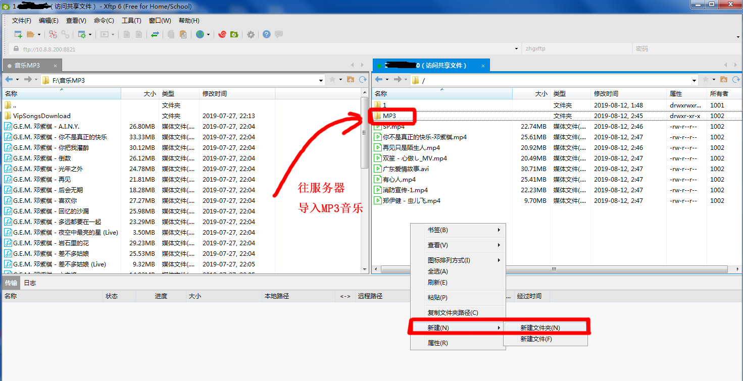 - 4. 新创建mp3目录,把MP3批量导入传输到服务器