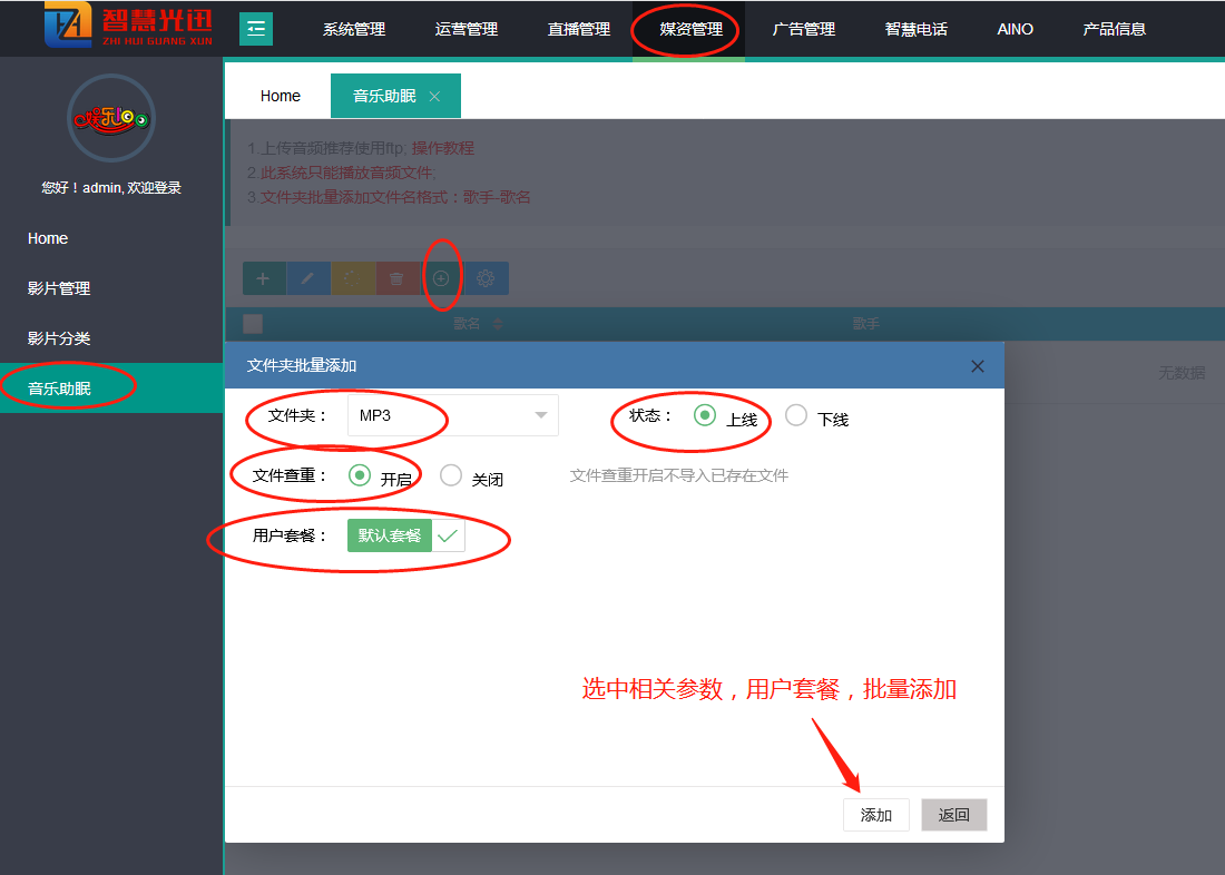 - 7. 勾选音乐所放目录,勾选上线、勾选用户套餐