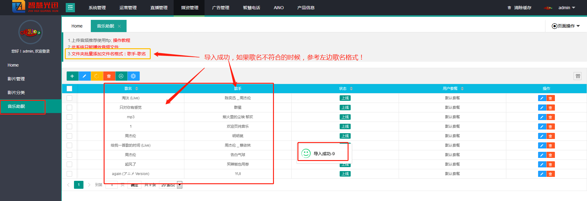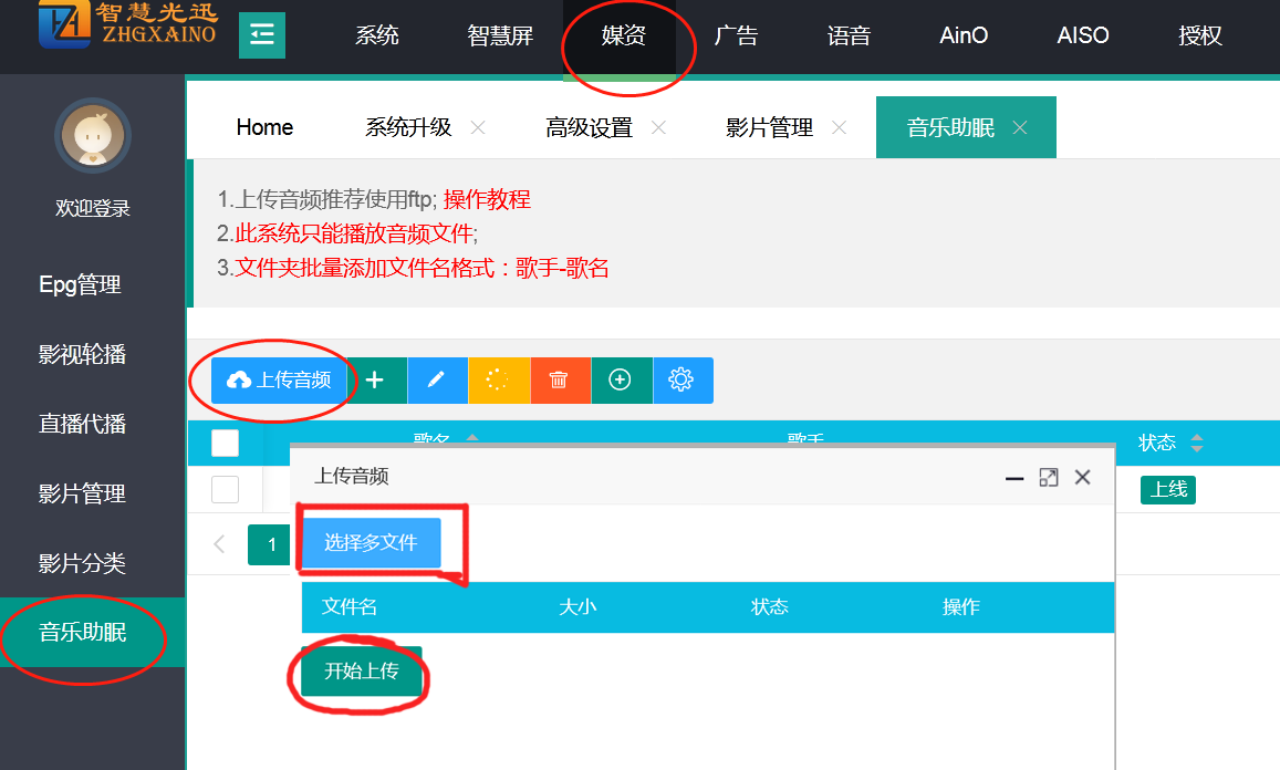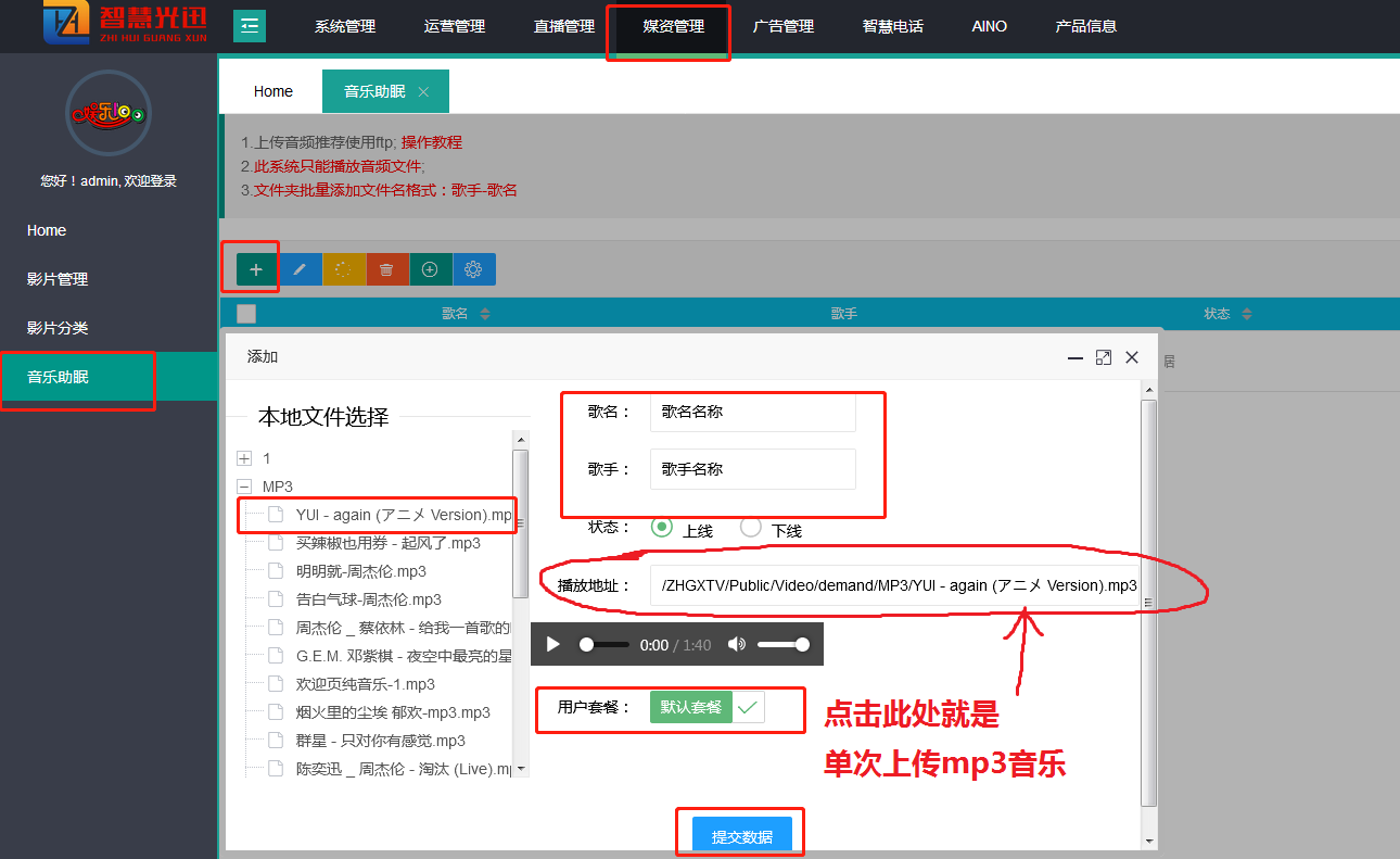 - 确认服务器管理IP(或通过内网交换机同网段情况速率最快,注意内网宽带有上行限速 》》 安装XFTP软件打开 》》根据服务器管理IP:8821端口FTP账号密码填写设置格式 》》添加MP3目录 》》 去往后台批量添加对应的音乐 》》同步对应APP菜单功能 》》用户套餐勾选上对应APP 》》 前端观看效果情况