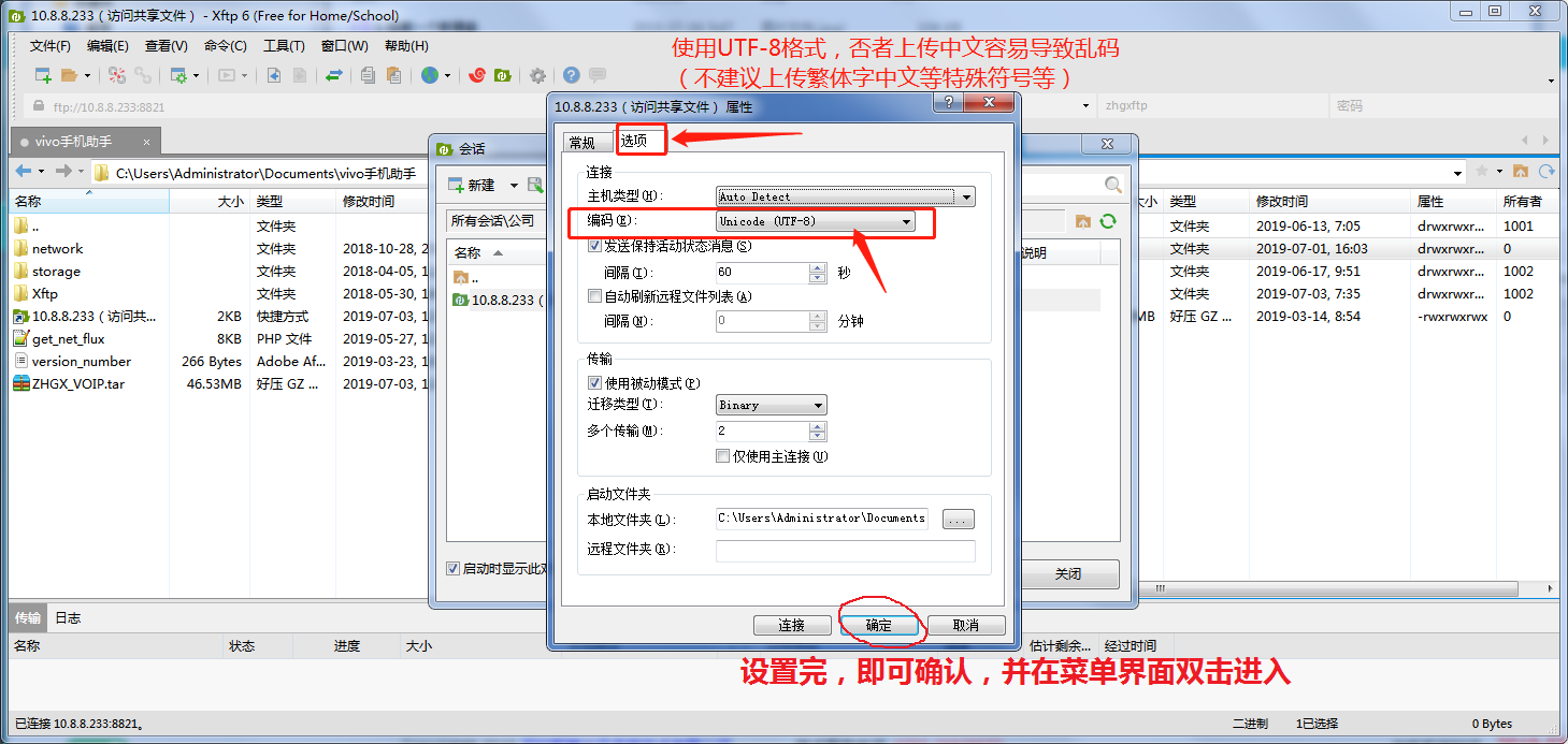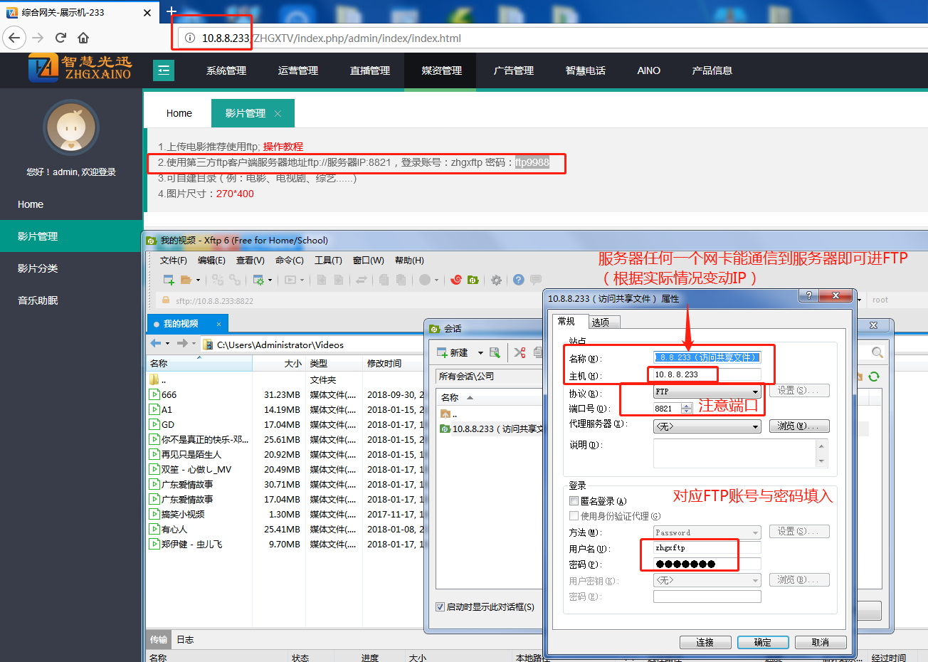 - 2. 使用第三方ftp客户端服务器地址ftp://服务器IP:8821,登录账号:zhgxftp 密码:ftp9988