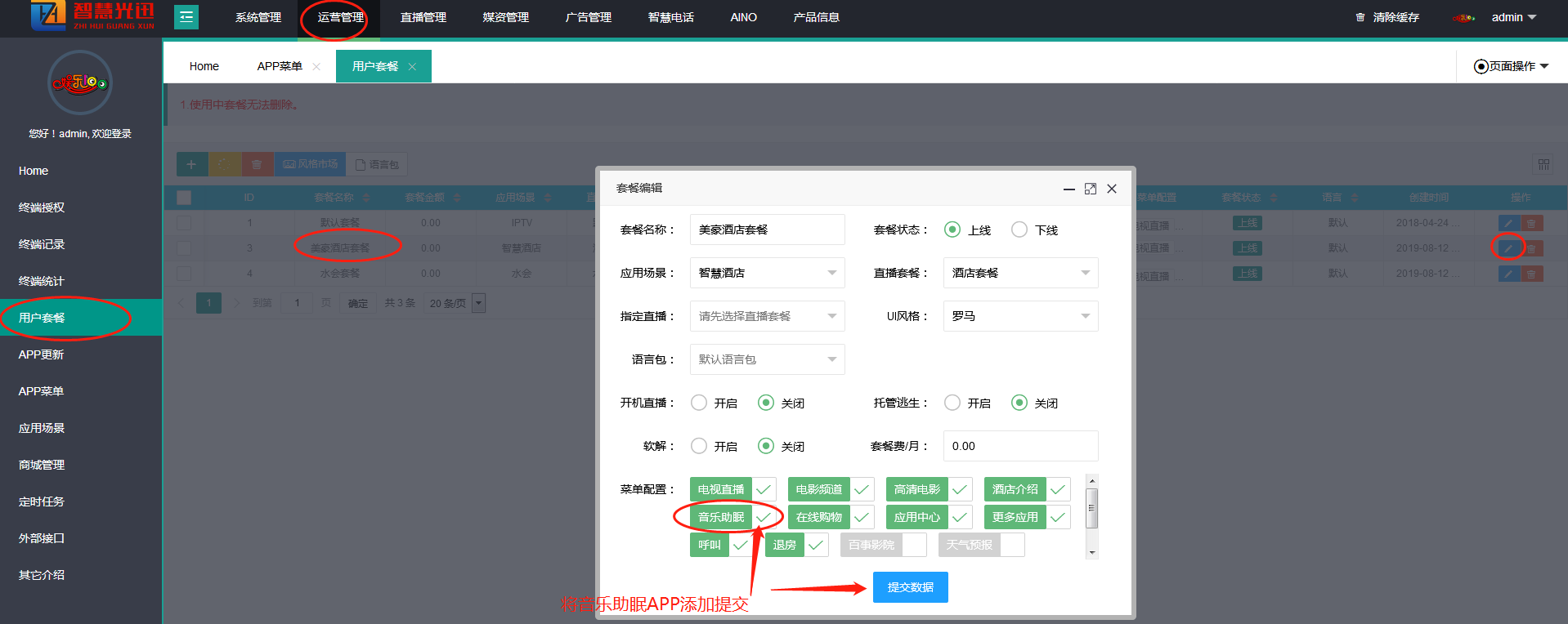 11. 将音乐助眠模块添加到用户套餐勾选