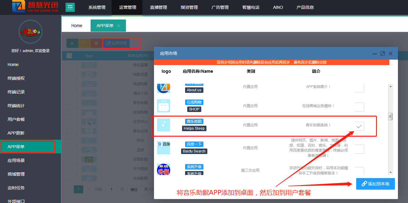 - 11. 将音乐助眠模块添加到用户套餐勾选