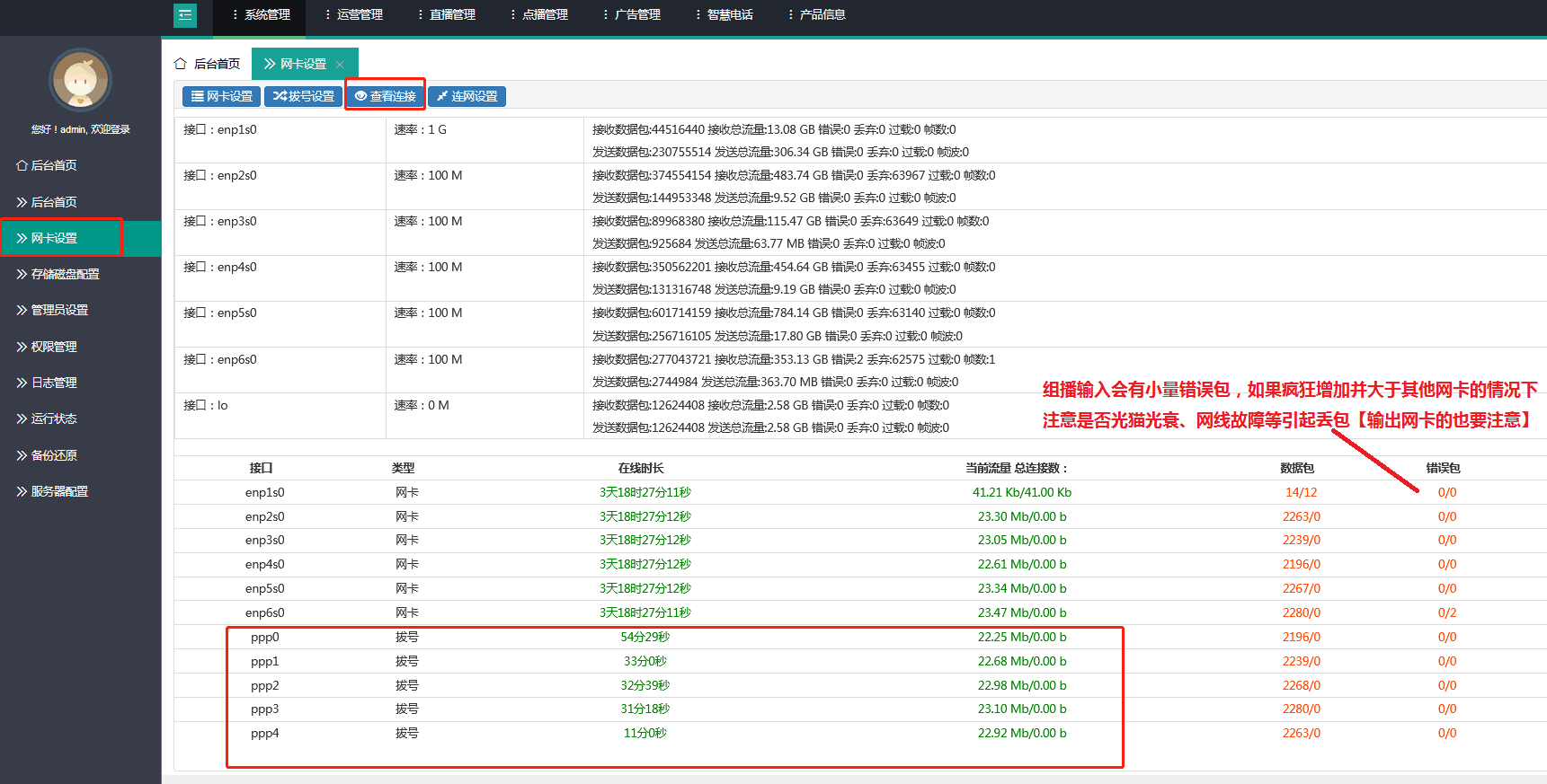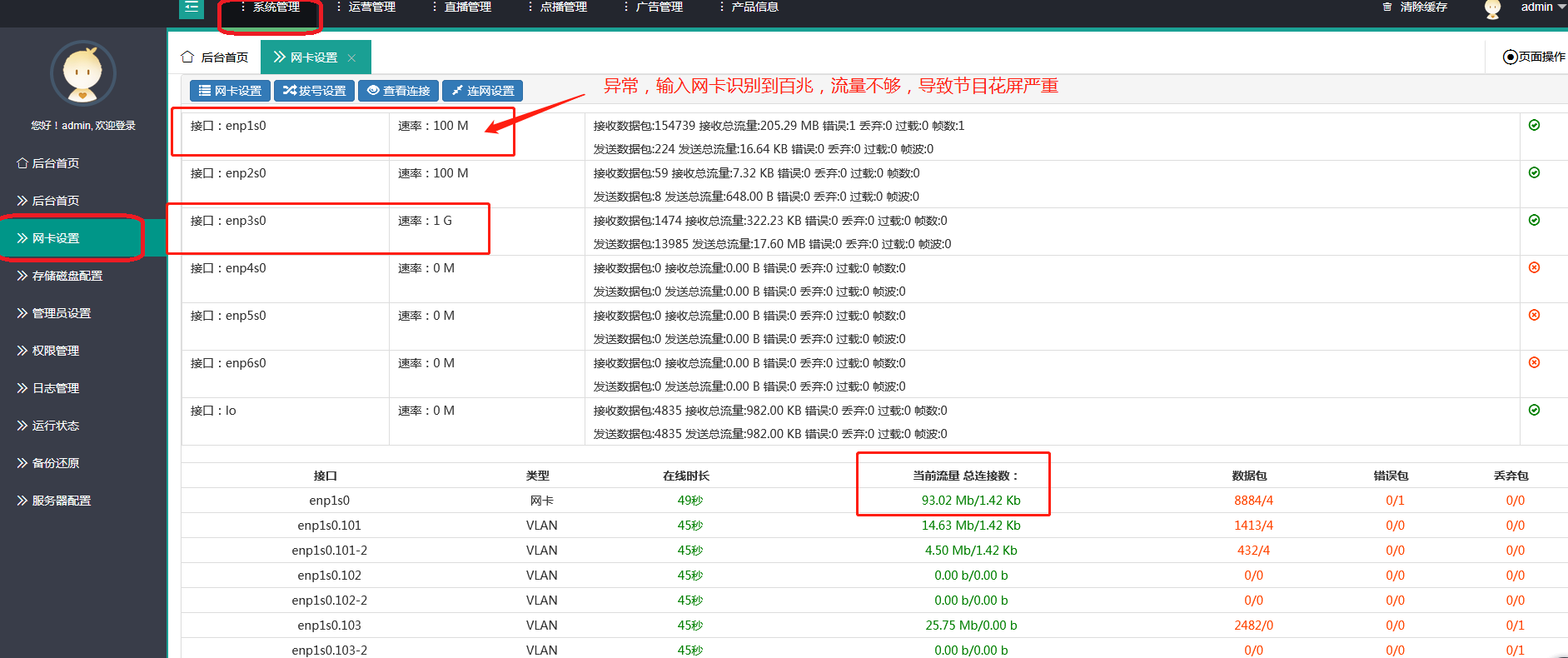 若出现以下网卡突然识别到【百兆输出】,或汇聚交换机方式采集的变成【百兆输入】,节目肯定有影响!