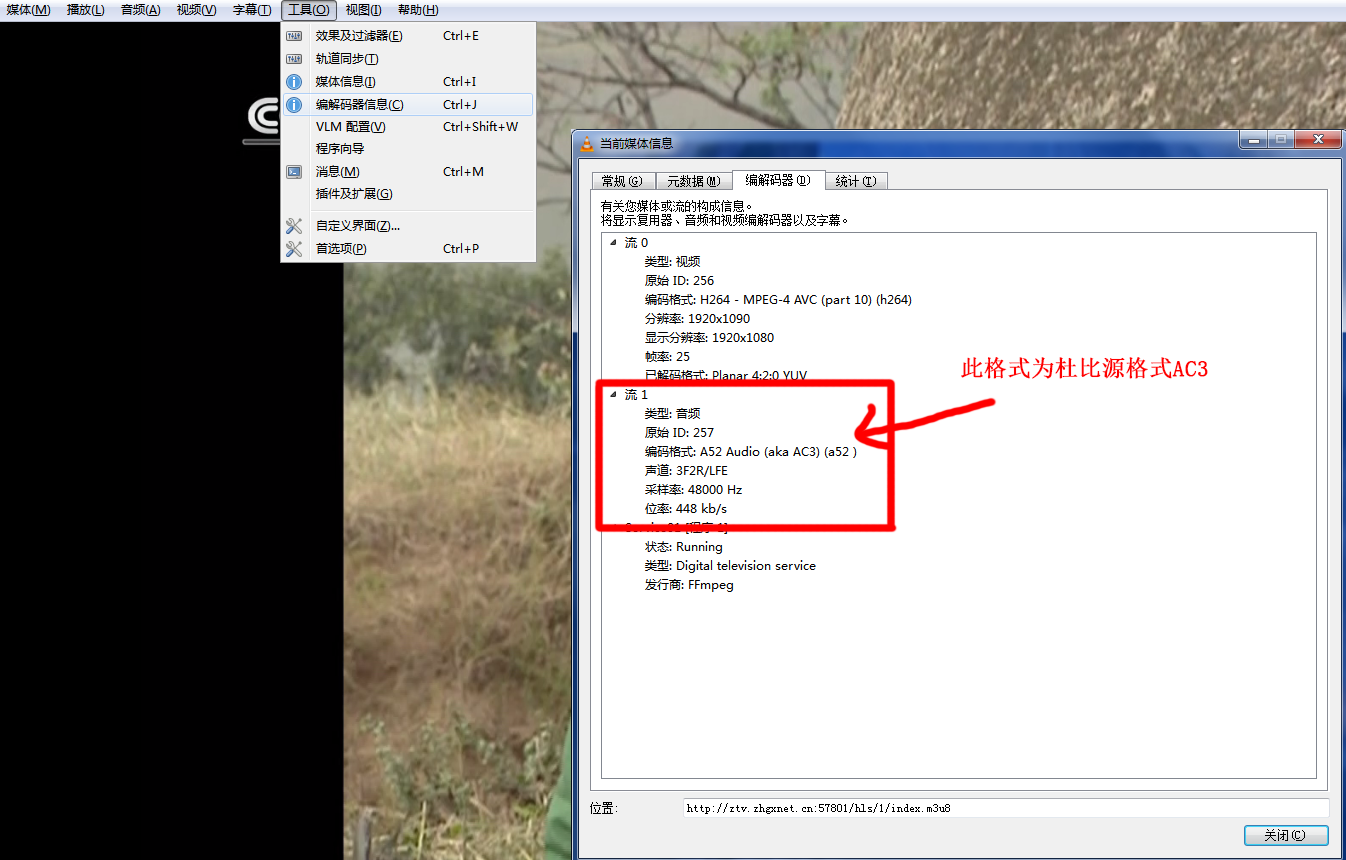 4. 源格式展示观看【检测是否杜比源,若为杜比格式AC3,就需要机顶盒支持杜比格式,若机顶盒不具备可在节目采集对此节目开启‘音频转码’重新采集此节目】