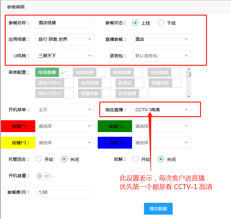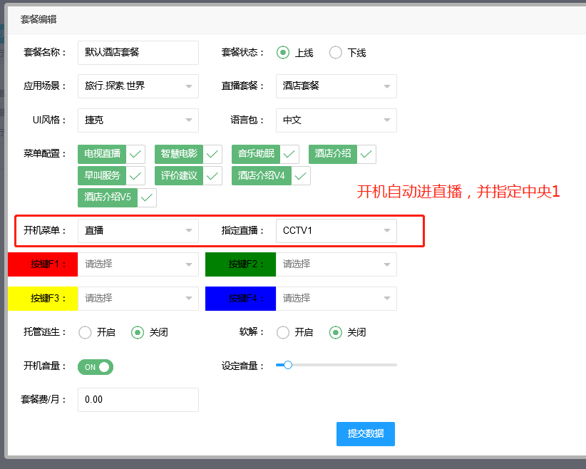 1:指定直播频道每次从首页、开机进直播后第一个播放的直播节目参数设置2:酒店一般默认设置观看CCTV1/或酒店内的酒店宣传视频轮播频道3:服务器轮播频道制作跳转 》 使用XFTP上传视频制作轮播频道4:最新版本,单独每次在首页桌面点击 电视直播的时候,第一个观看的是 “CCTV-1高清”5:最新版本,客户需求 开机自动进直播,并可以设置指定到某一个频道!~~ (开机进直播)1:指定直播频道每次从首页、开机进直播后第一个播放的直播节目参数设置2:酒店一般默认设置观看CCTV1/或酒店内的酒店宣传视频轮播频道3:服务器轮播频道制作跳转 》 使用XFTP上传视频制作轮播频道4:最新版本,单独每次在首页桌面点击 电视直播的时候,第一个观看的是 “CCTV-1高清”5:最新版本,客户需求 开机自动进直播,并可以设置指定到某一个频道!~~ (开机进直播)文档更新时间: 2021-02-20 14:55 作者:admin