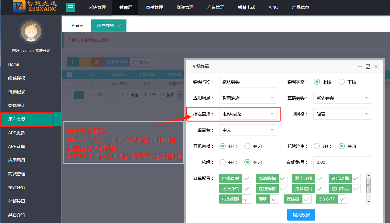 目录 搜索 一,系统简介↑ 点击支持模糊搜索 ↑二,系统的硬件配置和安装综合网关系统下载链接2.1 系统的硬件配置2.2 系统的安装2.2.1 制作系统安装U盘2.2.2 系统的安装步骤2.2.3 控制台配置管理地址教程2.2.4 重装系统后换机的流程三,系统常用功能设置3.1 设置向导教程流程(入门推荐)3.2 简单酒店、测试环境拓扑图3.3 配置应用中心整合应用APP3.3.1 应用中心V23.4 同步与添加第三方APP教程3.5 卸载、安装APP软件教程3.6 单终端测试新版本APK教程3.7 通过当贝市场安装U盘软件3.8 盒子热点跟随房间号自动生成3.9 创建多用户套餐、直播套餐对应3.10 导出直播节目重新排序顺序3.11 定时任务、定时重启流媒体3.12 修改终端天气预报地区3.13 广播寻址服务器IP免注册3.14 使用雷电模拟器测试后台效果3.15 使用PotPlayer测试节目列表(批量)3.16 终端到期提醒立即通知四,常见问题处理4.1 终端桌面数据无图标无背景4.2 快速判断节目是否采集正常4.3 服务器输出单播经过路由卡顿4.4 终端分辨率显示异常溺出修复4.5 闪雷80S下载慢无电影更新4.6 通过电脑VLC测试服务器输出4.7 UDP采集节目花屏处理4.8 看节目有画面无音频无声音4.9 直播无节目提示更新列表处理5.0 测试节目采集不到(各种情况)5.1 不显示欢迎页时效5.2 首页APP重复安装无法打开五,系统管理5.1 网态图5.2 网卡设置5.2.1 网卡设置(VLAN)5.2.2 拨号设置5.2.3 查看连接5.2.4 连网设置5.2.5 端口聚合(端口汇聚)5.3 诊断工具5.4 DHCP 5.5 NAT5.6 存储磁盘配置5.7 管理员设置(先创建权限)5.7.1 二级管理员首页链接5.8 权限管理5.9 日志管理5.10 运行状态5.11 备份还原5.11.1 备份下载与上传5.11.2 双机热备配置5.12 服务器配置(输出口)5.12.1 时移无法观看问题处理5.13 外部接口5.13.1 PMS接口后台服务器参数配置5.14 APP联动(通话音量变小)5.15 DNS服务【案例劫持】六,智慧屏6.1 终端授权6.1.1 免认证6.1.2 单个终端授权6.1.3 单个终端更换风格6.1.4 单个终端开软解6.1.5 终端远程控制操作6.1.6 终端卸载APP与安装APP6.1.7 未注册客户与到期用户6.1.8 终端故障换机步骤说明6.1.9 弹窗通知与紧急通知6.2 终端记录(通知、远程、服务)6.3 终端统计6.4 用户套餐6.4.1 套餐风格同步设置6.4.2 增加用户套餐6.4.3 添加语言包6.4.4 开机自动进入直播6.4.5 指定直播频道(每次)6.4.6 软解功能、托管逃生6.4.7 开机指定音量(root权限)6.5 APP更新6.5.1 APP更新6.5.2 全部升级6.5.3 按套餐升级6.5.4 停止升级6.6 APP菜单6.6.1 添加新APP、同步商城6.6.2 上传第三方APP6.6.3 APP排序6.6.4 视图109-打开指定网页6.6.5 强制升级第三方APP推送6.7 应用场景6.7.1 酒店场景配置6.7.1.1 酒店介绍V4/V5版本6.7.1.2 酒店宣传介绍图片(旅游景点、美食推荐、本地特产)6.7.2 小区场景配置6.7.2.1 小区终端到期提醒6.7.3 上传首页视频6.7.4 配置应用中心6.7.5 酒店房价牌6.7.6 医院场景6.7.6.1 医师介绍配置6.8 商城管理6.8.1 商品列表6.8.2 商品分类6.8.3 商品订单6.8.4 通用设置(商城背景电话)6.9 定时任务(系统→ 定时任务)6.9.1 直播视频定时插播任务6.9.2 定时终端开机关机(盒子等)6.9.3 定时重启采集流媒体6.9.4 终端管理(安装与卸载)6.9.5 定时清空APP缓存空间(常用)6.9.6 定时终端ADB命令任务6.9.7 定时重启AINO终端6.10 外部接口(PMS)6.11 其他介绍6.11.1 介绍列表6.11.2 介绍分类6.12 保险柜(防非房)(裁剪无法使用)6.13 设备绑定(语音对接)6.14 留言板6.15 易模板七,直播管理(媒资)7.1 直播节目7.1.1 直播节目添加7.1.2 直播节目编辑7.1.2.1 多节目源添加方式(双源)7.1.2.2 回看状态开启7.1.2.3 节目批量编辑7.1.3 直播节目上线与下线7.1.4 直播节目批量导入导出7.1.5 节目排序与一键排序7.1.6 回看服务器7.1.7 直播节目加密7.2 直播分类7.3 直播套餐7.4 节目采集7.4.1 添加与导入导出采集节目7.4.2 采集单播节目7.4.3 采集组播节目7.4.4 批量修改输入输出网卡7.4.5 节目采集启动与停止7.4.6 调试组播输出电脑观看7.4.7 HTTP、RTSP源拨号采集7.4.8 静态IP指定采集HTTP7.4.X 安视接入(门禁、监控等)7.5 Epg管理7.5.1 同步EPG(节目预告)7.5.2 添加本地epg7.6 影视轮播(自办节目)7.6.1 新影视轮播(分辨率一致)7.7 直播代播(组播输入单播输出)(动态流量)7.8 直播广场7.8.1 采用OBS推流(开直播、DY)7.9 自媒体(短视频宣传)八,媒资管理(媒资)8.1 影片管理8.1.1 调用网络地址视频播放8.1.2 使用XFTP上传本地视频8.1.3 对接闪雷80S本地点播8.1.4 使用闪雷批量扫描导入电影8.1.5 闪雷80S对接腾讯会员VIP8.1.6 使用闪雷单部导入电影8.2 影片分类(点播背景图片)8.3 音乐助眠8.3.1 单首上传(批量文件)九,广告管理9.1 文字广告9.2 开机广告9.2.1 图片广告9.2.2 视频广告(APK-4.0.20以上)9.3 首页广告9.4 直播广告十,智慧电话10. 对接语音网关(O口)呼出外网10.1 状态10.2 基本设置10.2.1 基础设置10.2.2 网络设置10.2.3 拨号规则10.2.4 总机10.2.5 IVR(语音导航)10.2.6 语音管理10.3 分机设置10.3.1 添加部门号码与IP分机10.3.2 查看 IP 分机账单10.3.3 批量导入分机号码10.3.4 批量充值分机10.4 外线设置10.5 应用服务(主动叫醒服务)10.6 高级设置(强接、盲转、询问转、呼叫前转)10.7 电话日志10.8 录音管理10.9 智慧CALL10.10 使用eyeBeam注册分机(电脑)10.11 注册SIP-IP网络电话机(支持WEB)10.12 前台接听后呼叫转接(转移)10.13 对接智慧网关4O-8O(教程)10.14 正则表达式说明10.15 内外网来电铃声控制(彩铃)10.16 定时勿扰(定时免打扰电话)10.17 呼叫中心(短号群组)十一,AINO(光纤组网