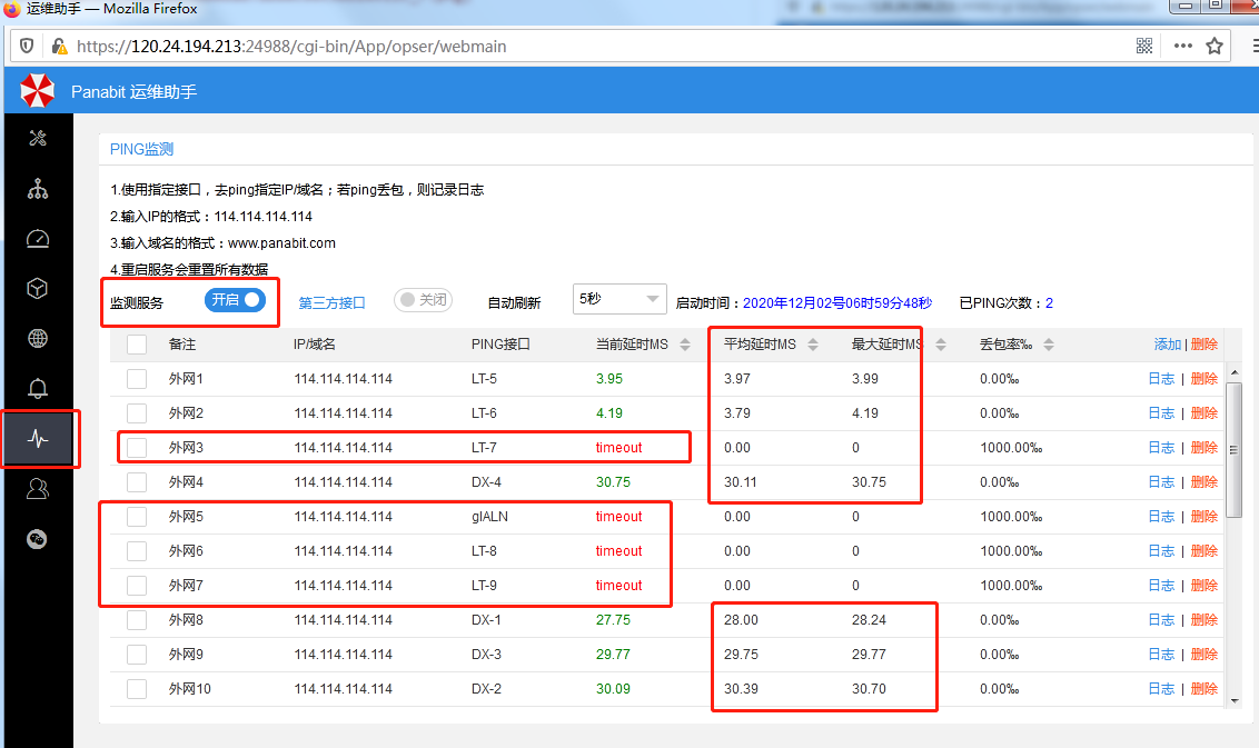 注:此功能不推荐长期使用,否者日志涨的很多后会造成故障!(日志空间存储一直涨)1:开启Ping检测,添加需要通信的IP,添加需要判断的外线2:检测判断外线资源哪些延迟大的情况3:测试完后,尽量关闭检测服务,避免消耗进程注:此功能不推荐长期使用,否者日志涨的很多后会造成故障!(日志空间存储一直涨)1:开启Ping检测,添加需要通信的IP,添加需要判断的外线2:检测判断外线资源哪些延迟大的情况3:测试完后,尽量关闭检测服务,避免消耗进程文档更新时间: 2021-04-06 16:17 作者:admin